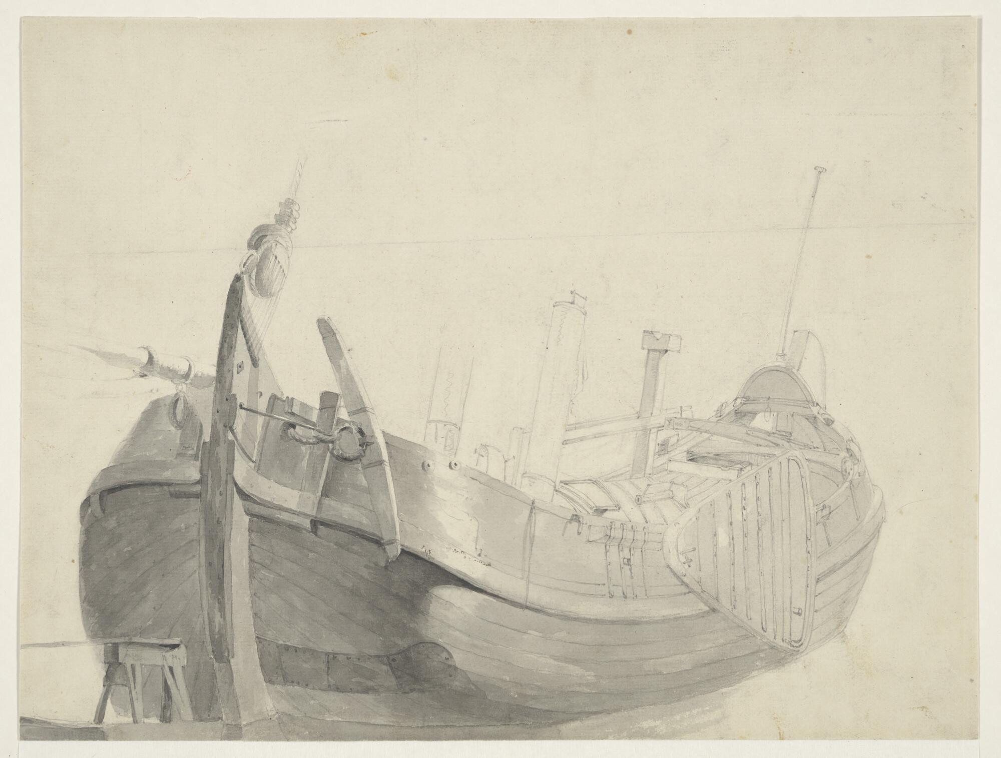 Tekening van een hektjalk, gezien van voren, bakboordzijde. Verso: aanhechting van sprietzeil aan de gaffel en de namen van de onderdelen.