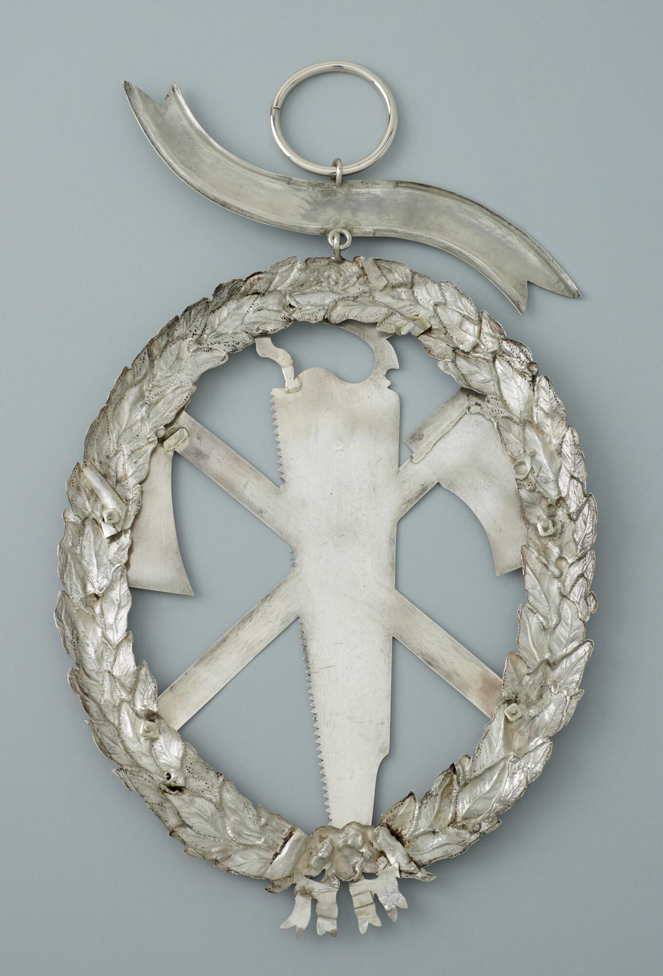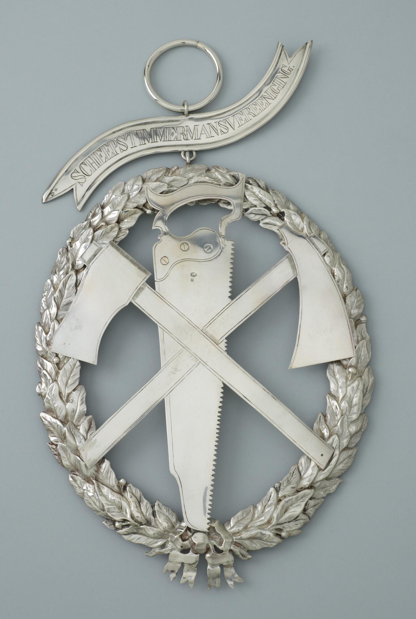 Zilveren insigne van de Scheepstimmermansvereniging 'De Eendracht' uit Amsterdam. Binnen een lauwerkrans is een zaag afgebeeld, met daarvoor gekruist een bijl en een dissel.
