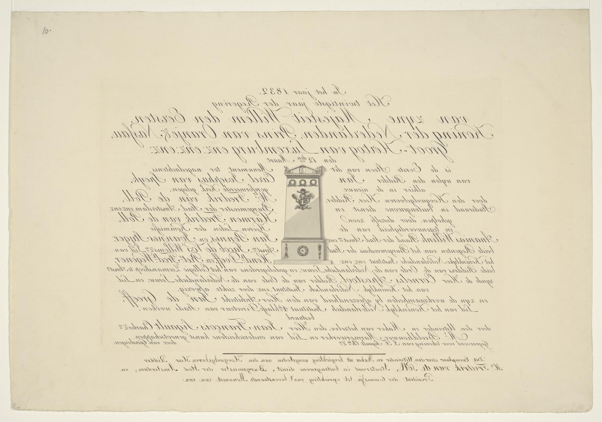 Ontwerp voor een etsplaat: monument ter ere van Van Speyk, opgericht in de Nieuwe Kerk, in 1832 met uitgebreide tekst.