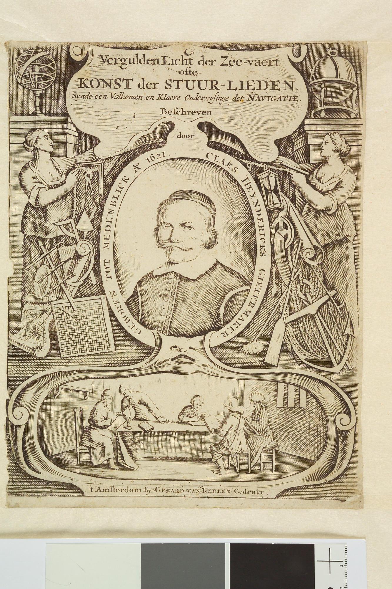 Titelprent van de 'Konst der Stuurlieden' door Claes Heyndricksz Gietermaker, met portret van de schrijver en afbeeldingen met betrekking tot de navigatie.