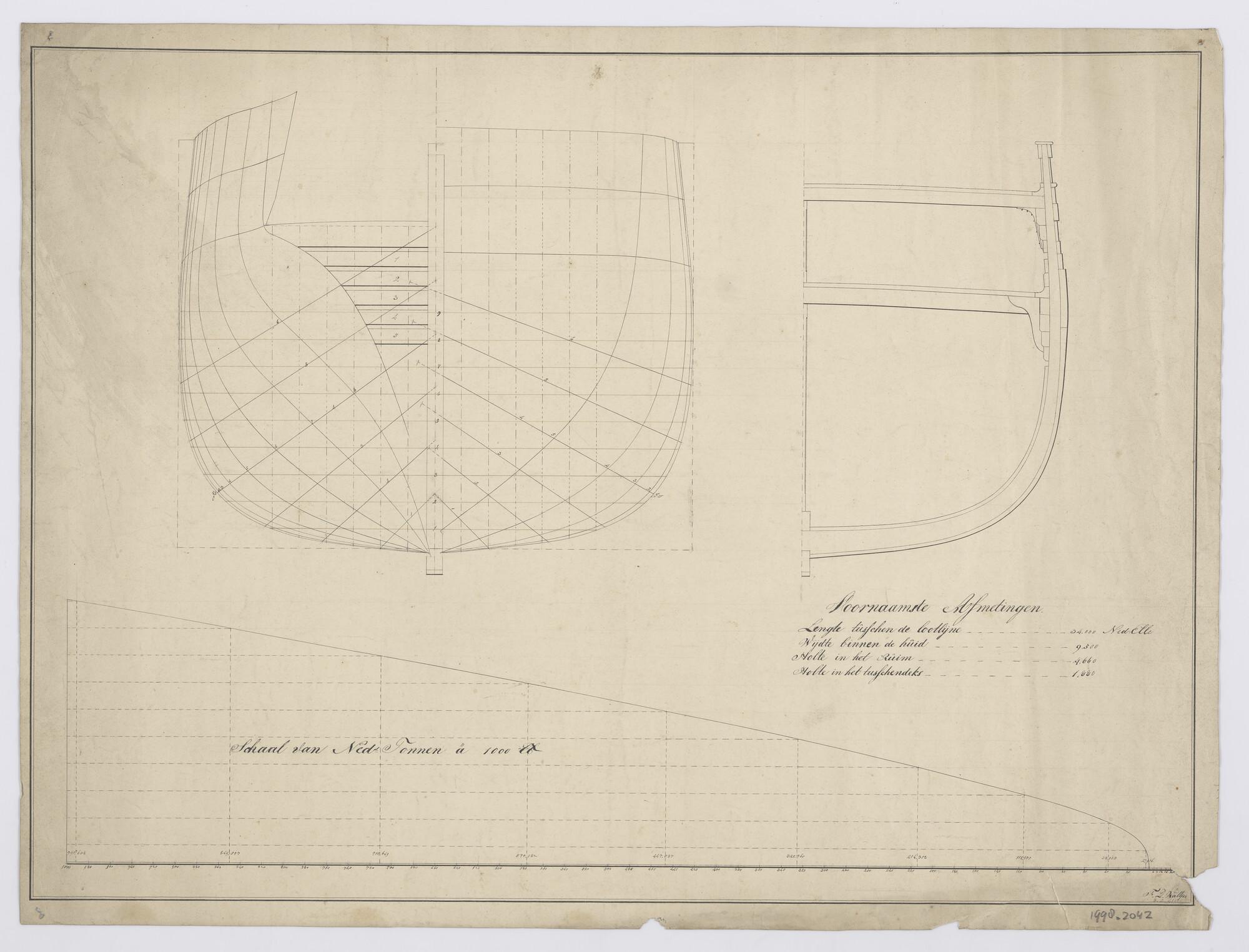 Voor- en achteraanzicht en grootspant van een zeilschip van 34 Nederlandse [...]