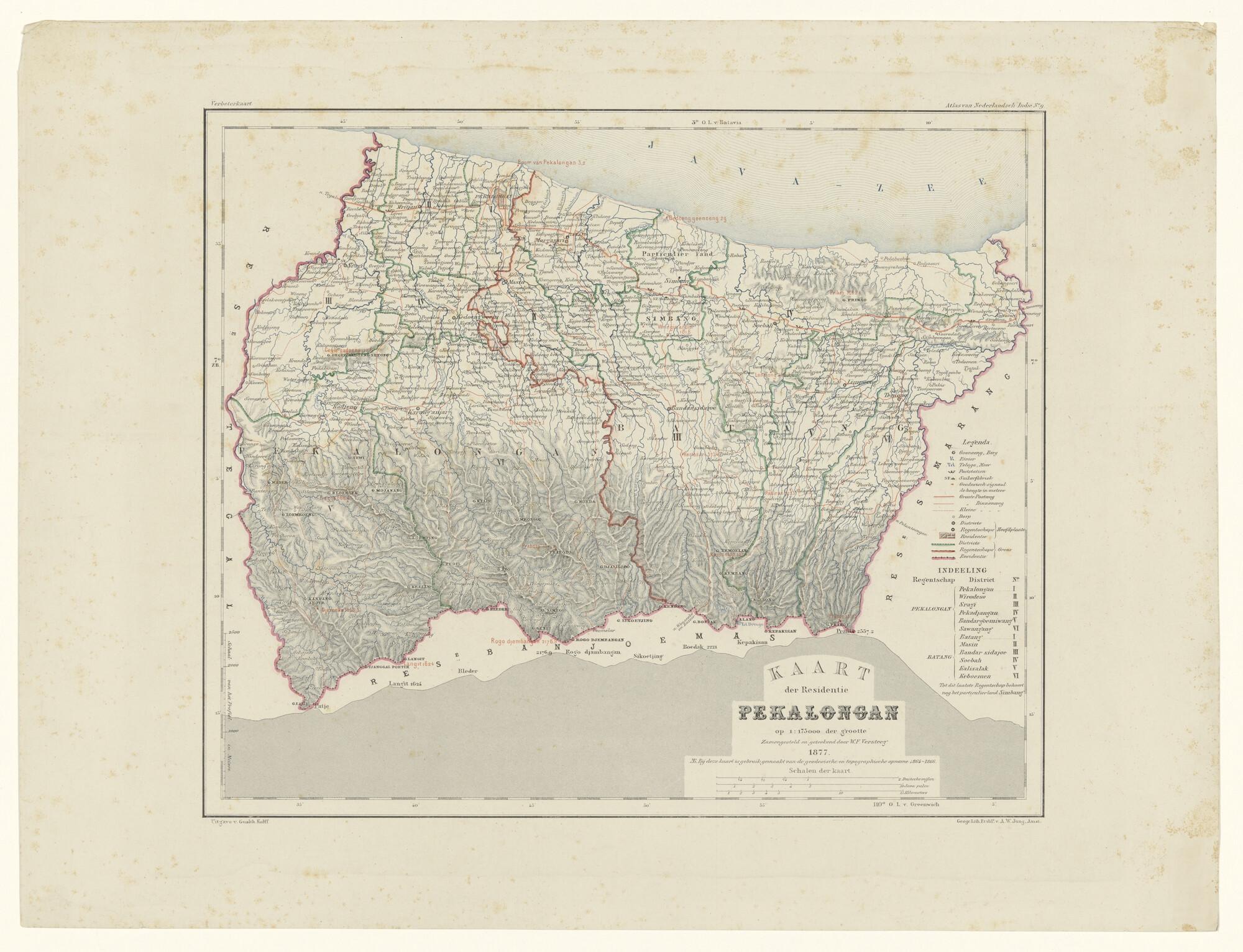 Kaart van de residentie Pekalongan. Samengesteld door W.F. Versteeg in 1877. Lithografie A.W. Jung Amsterdam, uitgave Gualthei Kolff, circa 1877. Verbeterkaart 9 uit de Atlas van Nederlandsch Indië (schaal 1 op 175.000).