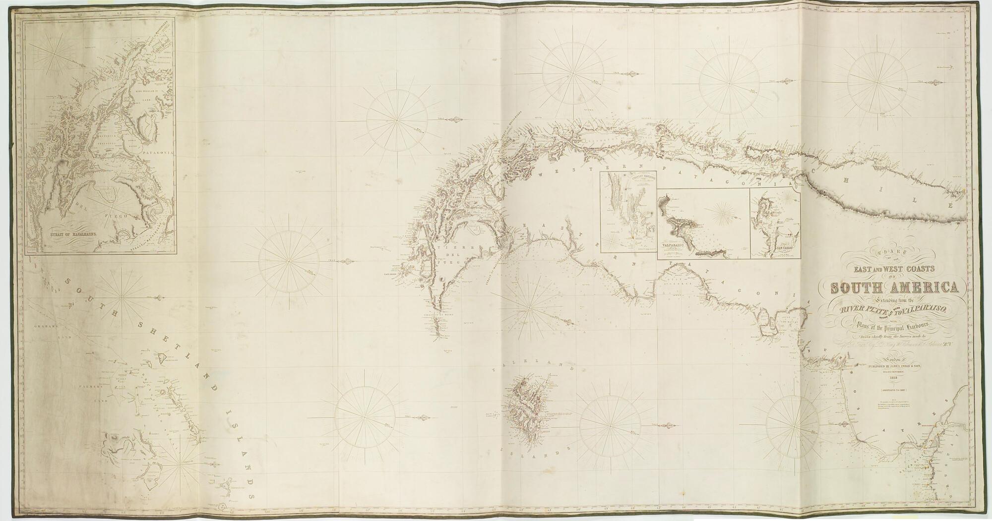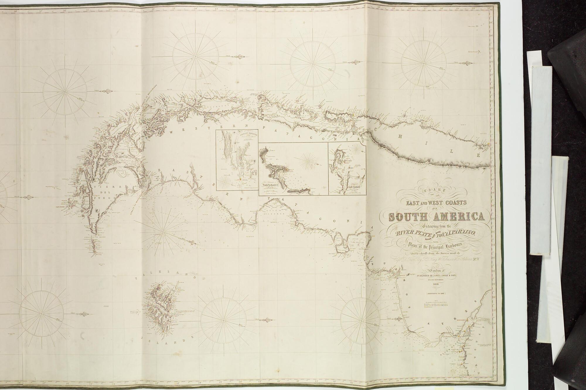 Kaart van de oost- en westkust van Zuid-Amerika naar opnamen van Robert FitzRoy (1805-65), Peter Parker King (1793-1856), William Robinson en B.J. Sullivan. Met detailkaarten. Uitgave J. Imray & Son (1854-99), Londen, 1858, verbeterd 1867. Lengte volgens Greenwich.