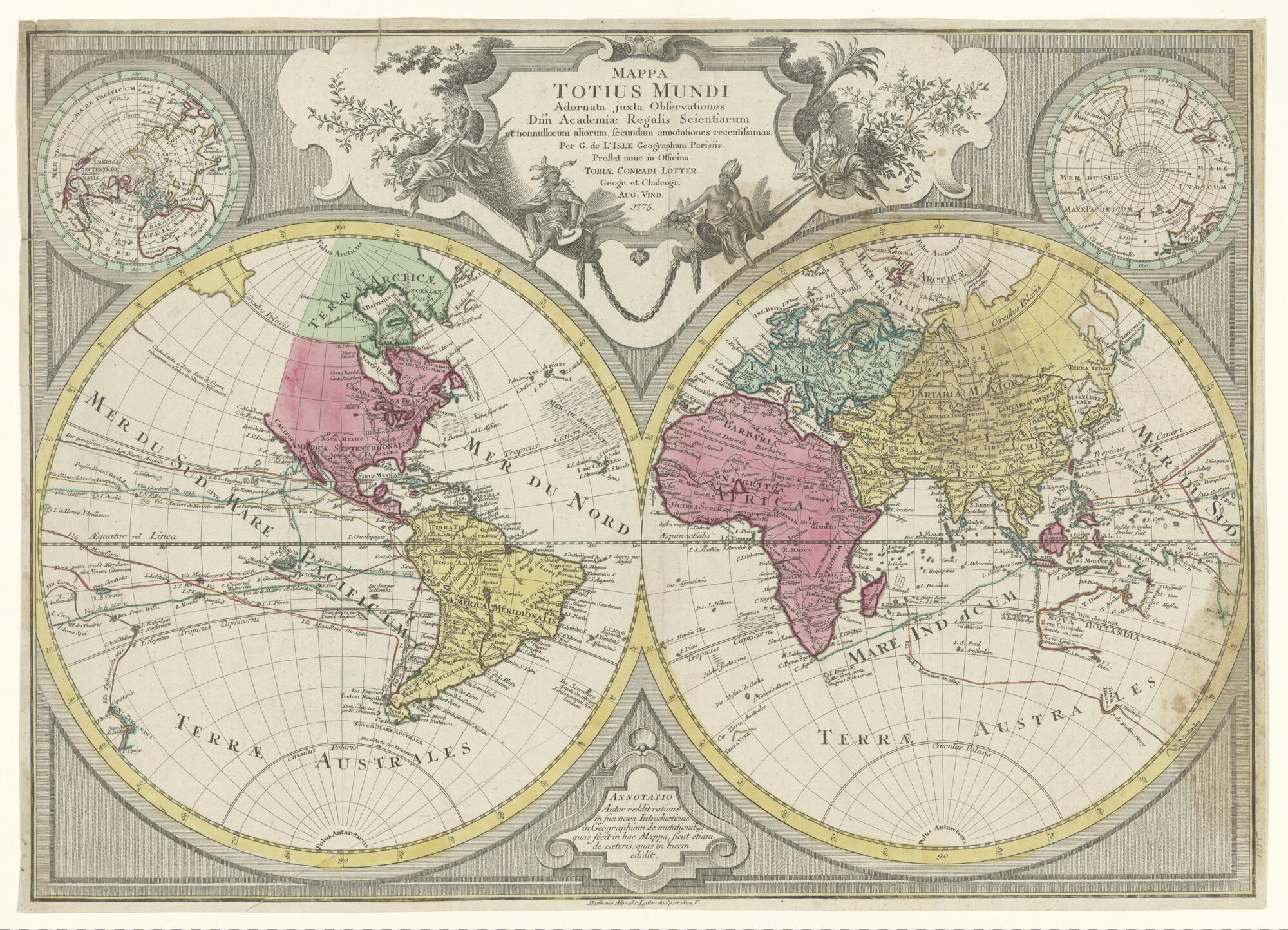 Wereldkaart naar Guillaume De l'Isle (1675 - 1726), in twee halfronden, uitgegeven te Augsburg, 1775, door T.C. Lotter (1717 - 1777)