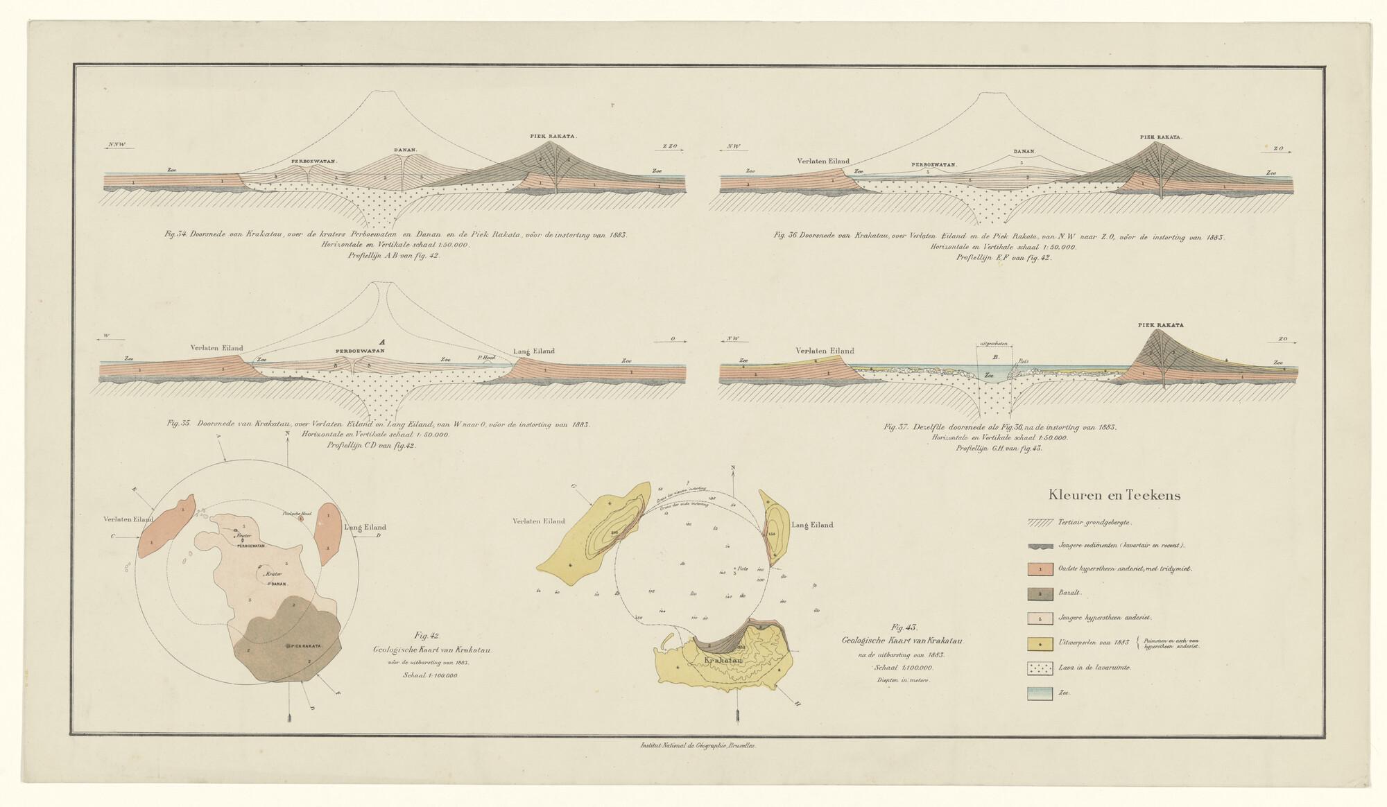 Gekleurde boven- & zijaanzichten van na de uitbarsting van de Krakatau van 27 augustus 1883. Uitgave Institut National de Géographie, Brussel, circa 1883 (schaal 1 op 50.000, schaal 1 op 100.000).
