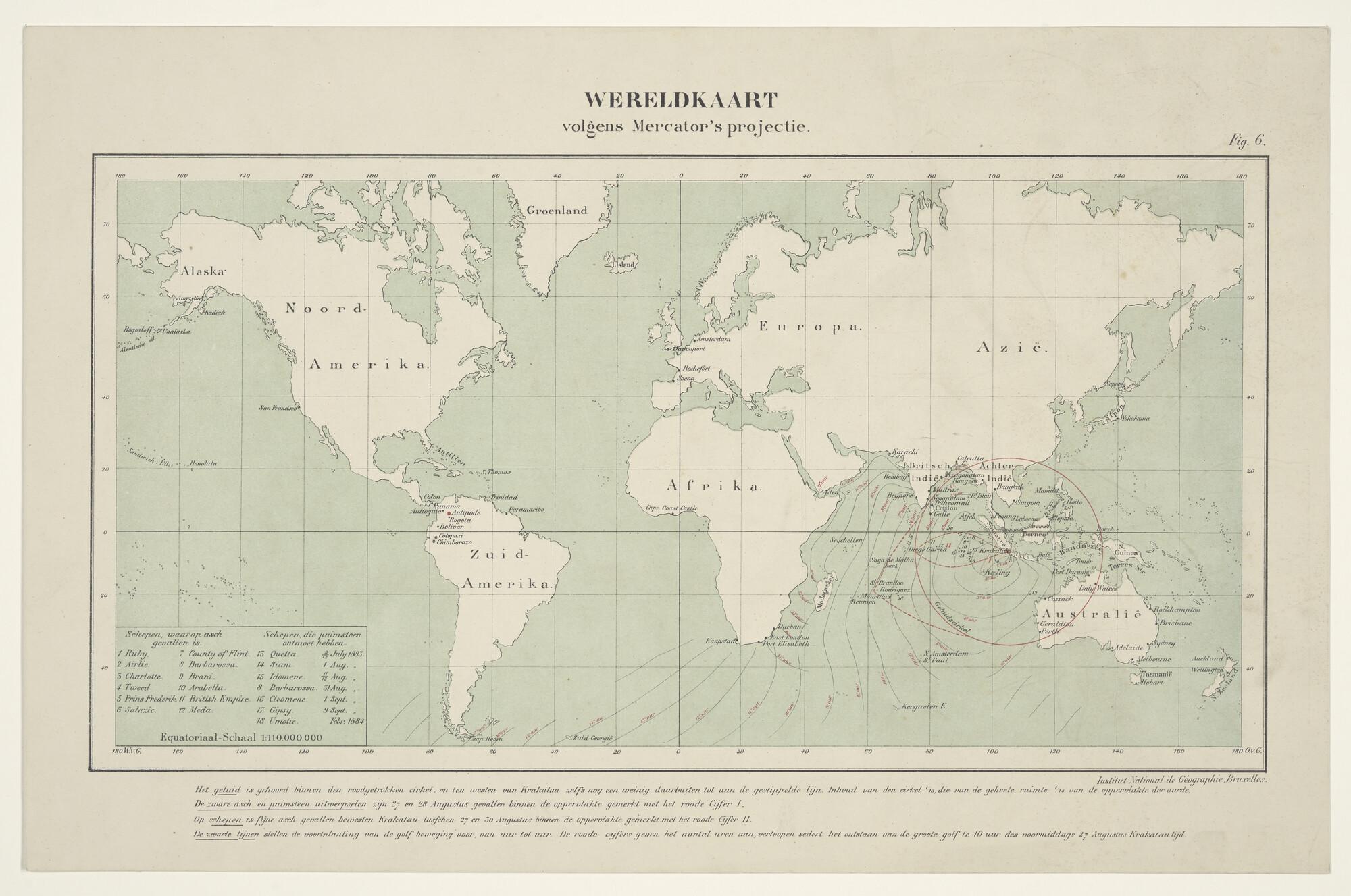 Gekleurde wereldkaart waarop de effecten van de uitbarsting van de Krakatau op 27 augustus 1883 zijn ingetekend. Uitgave Institut National de Géographie, Brussel, circa 1883 (schaal 1 op 110.000.000 ).