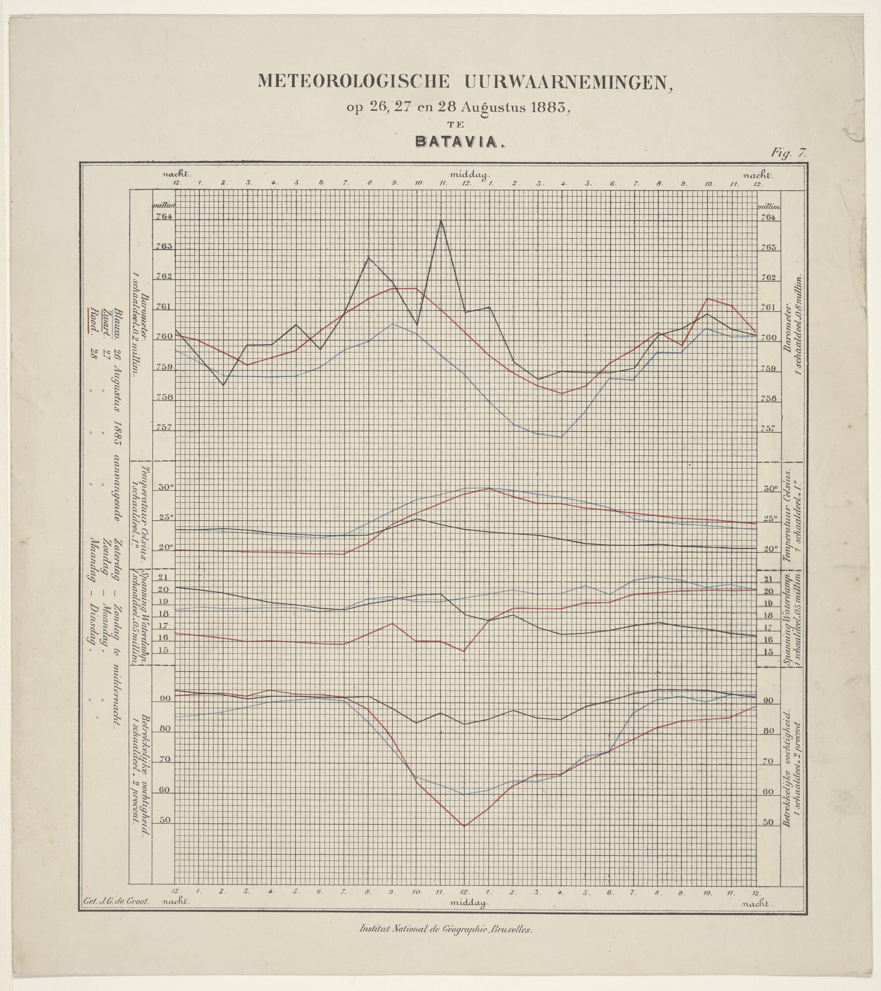 Gekleurde grafiek van meteorologische uurwaarnemingen te Batavia door J.G. de Groot. Uitgave Institut National de Géographie, Brussel, circa 1883