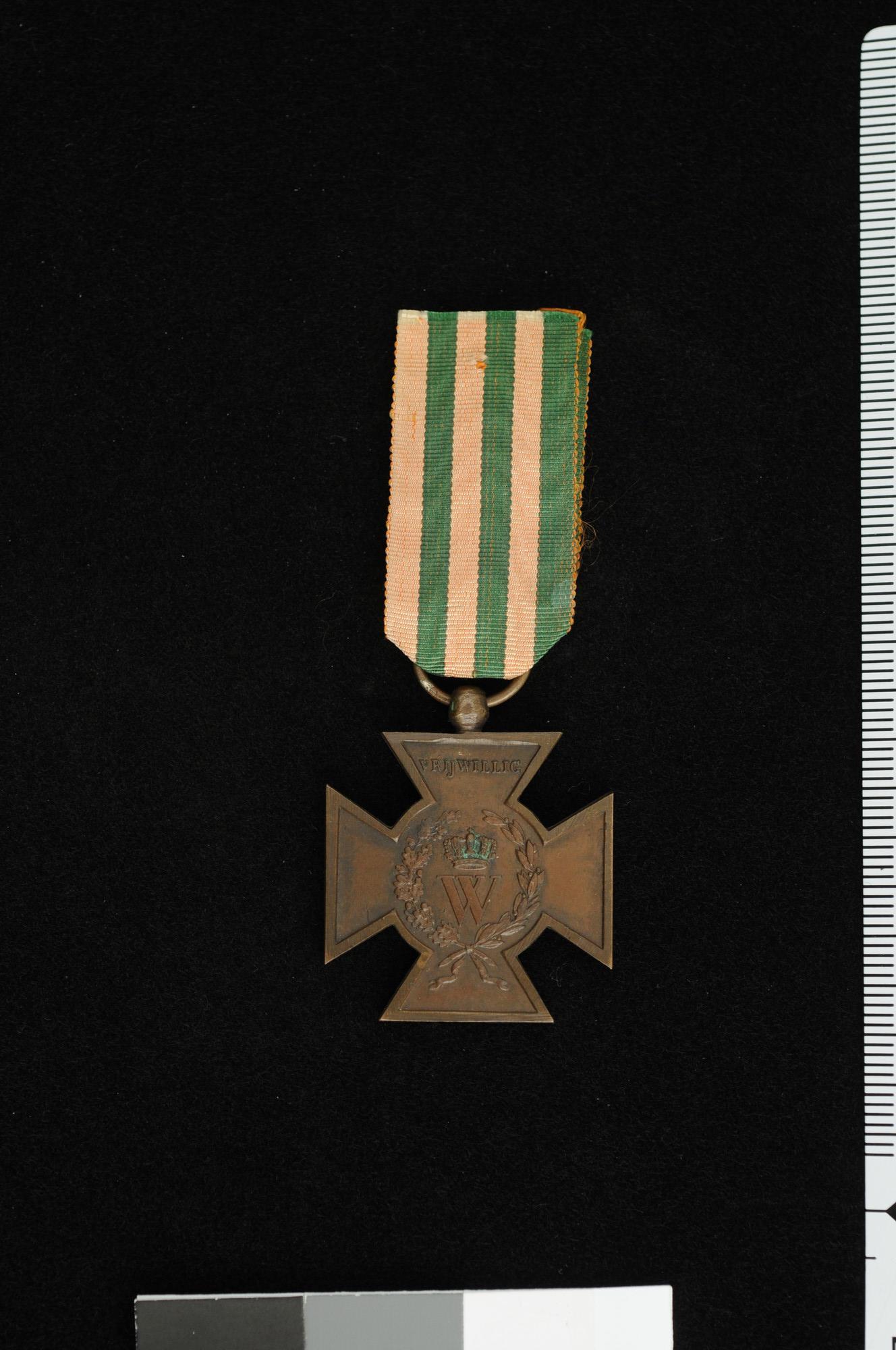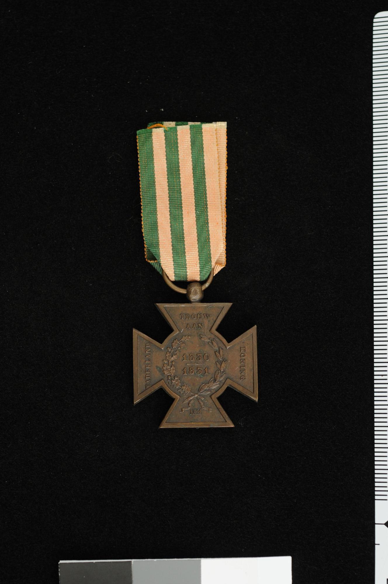 Metalen Kruis Vrijwilligers 1830-1831 met groengeel lint. Toegekend als ereteken voor vrijwillige deelname aan de gevechten tijdens de Belgische Revolutie. De medaille staat ook bekend als Hasseltkruis, naar verluid werden deze medailles vervaardigd van brons van tijdens de Slag bij Hasselt buitgemaakte kanonnen. Dit wordt betwist.