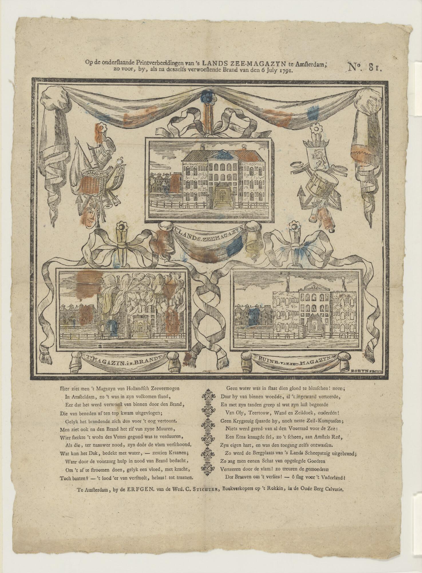 Volksprent met drie afbeeldingen van het Zeemagazijn, voor, tijdens en na de brand van 1791.