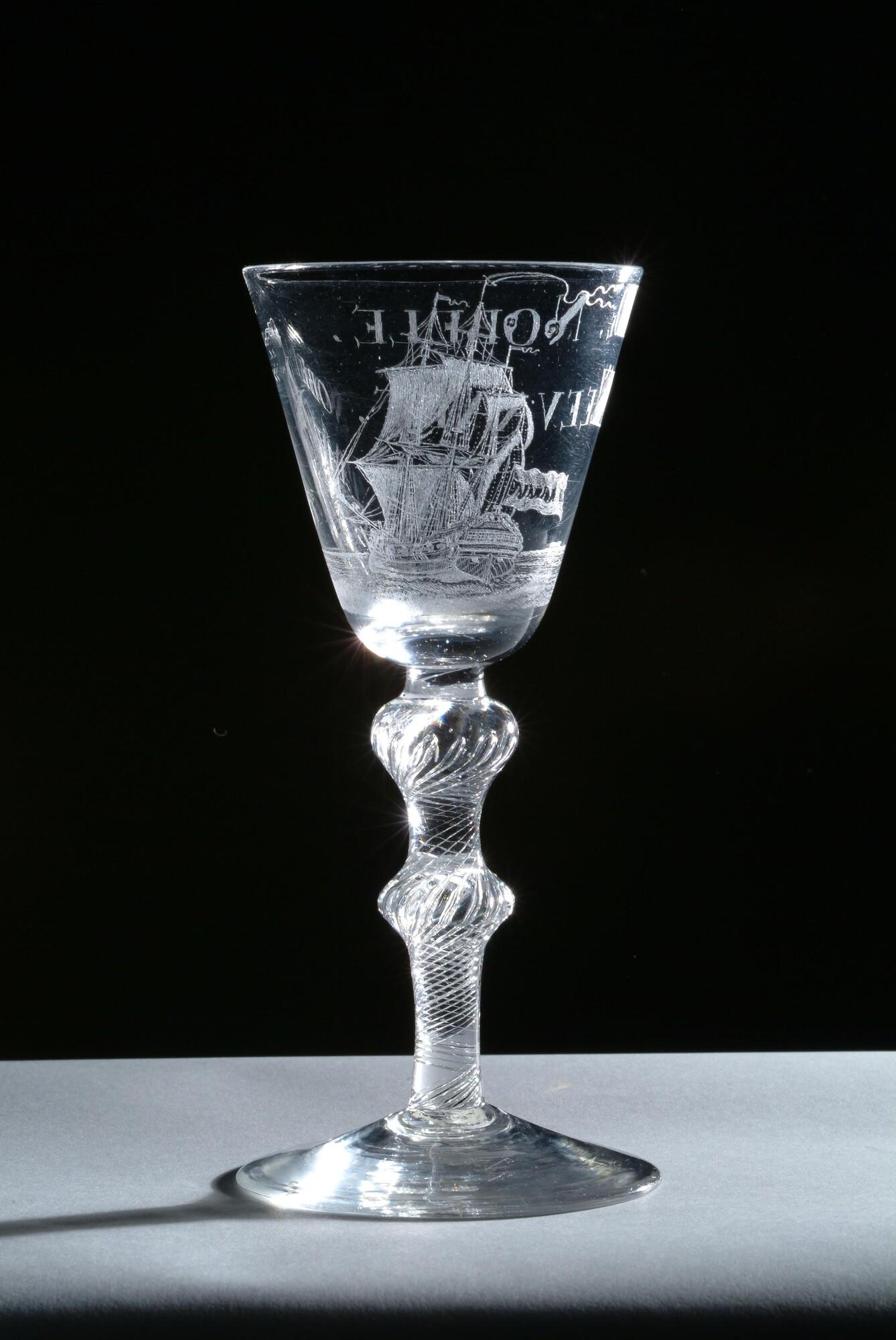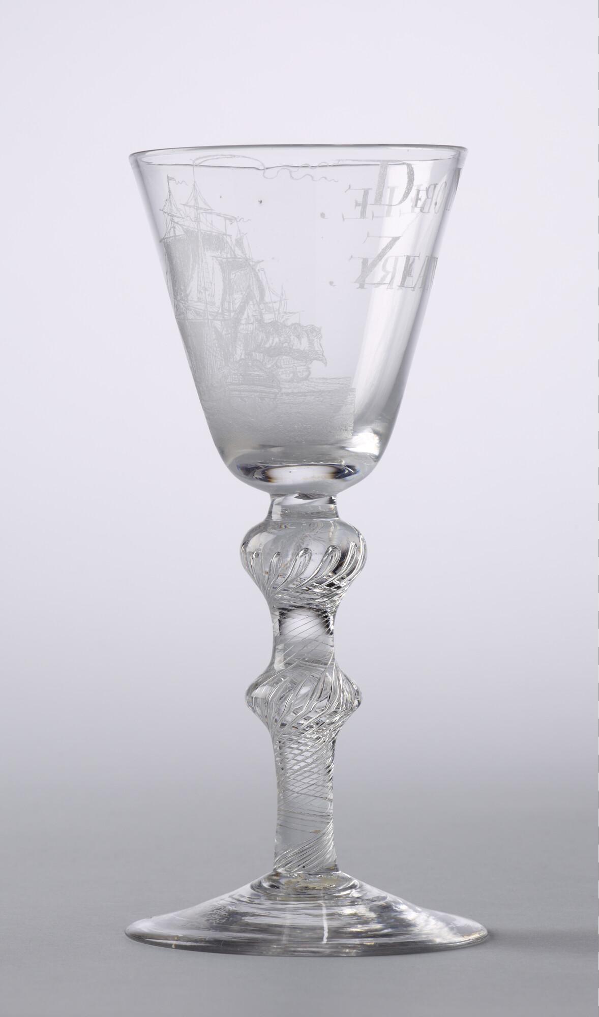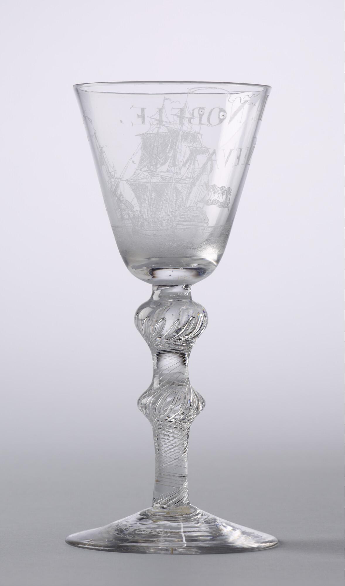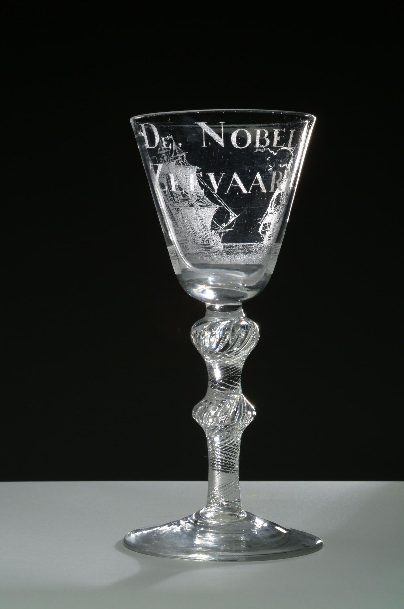 Kelkglas met een diamantgravure van twee driemasters en het opschrift "De Nobele Zeevaart".