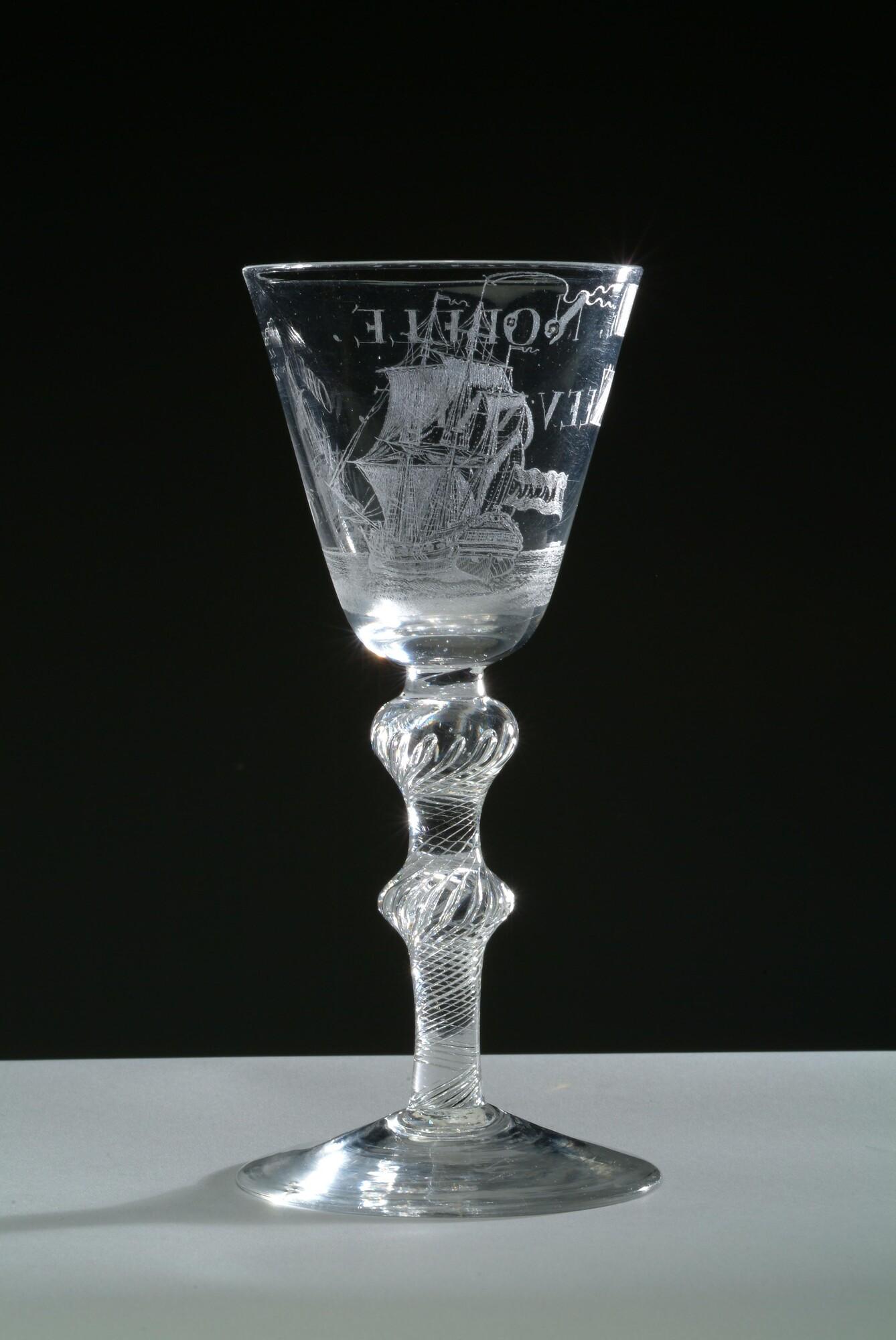 Kelkglas met gegraveerde afbeelding van twee driemasters