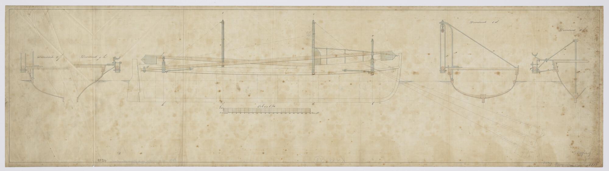 Spartorpedo-inrichting op de ijzeren stoombarkas ten dienste van het schroefstoomschip der eerste klasse Zr.Ms. "Tromp". Twee sparren: BB naar voren en SB naar achteren. Zijaanzicht en twee dwarsdoorsneden. Outriggers (uithouders) voor de beide sparren. Springlading (schaal 1:20).