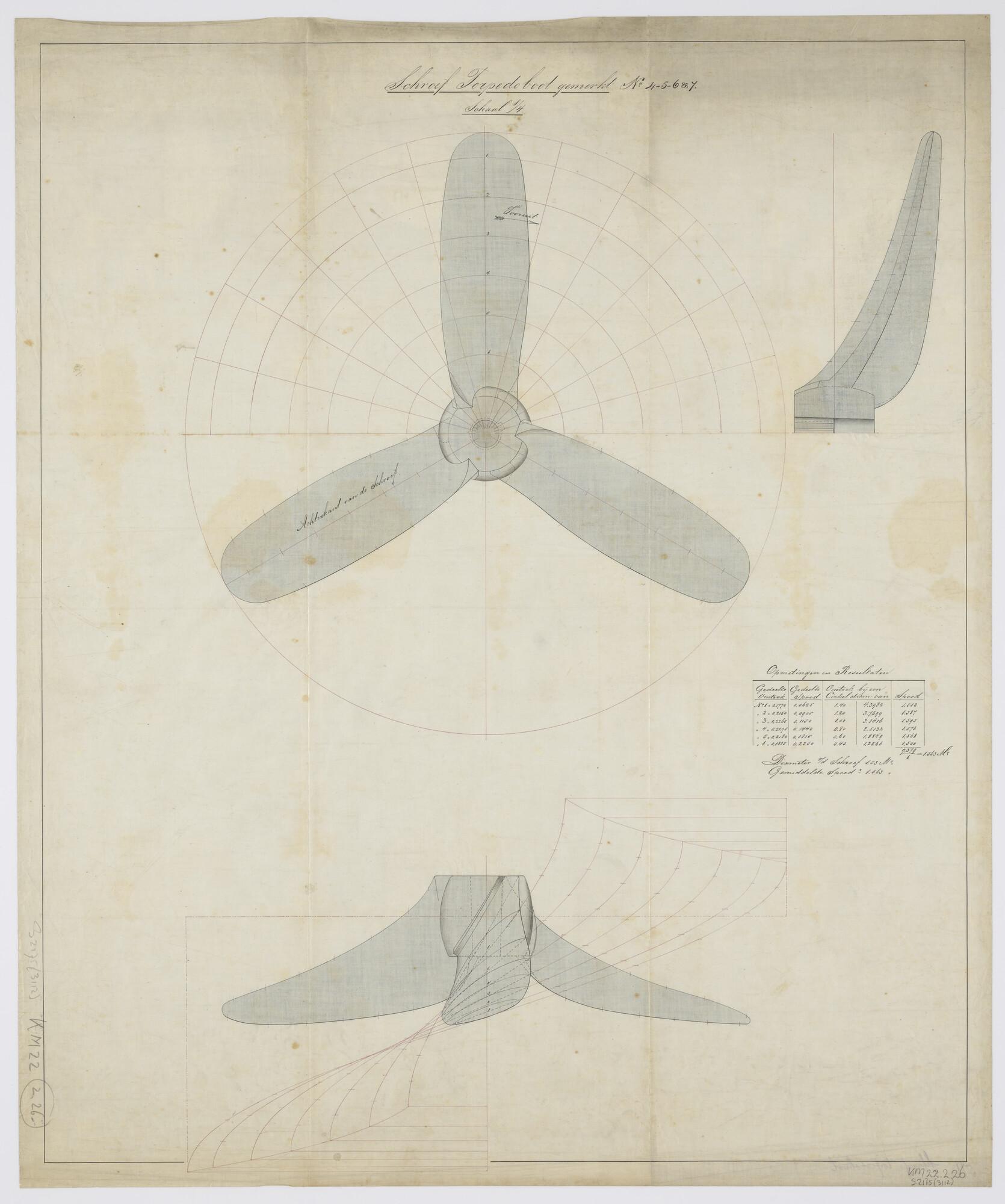 Achterkant en zijaanzichten van de schroef met opmetingen en resultaten aan boord van spartorpedoboot Zr.Ms. 'IV' [...]