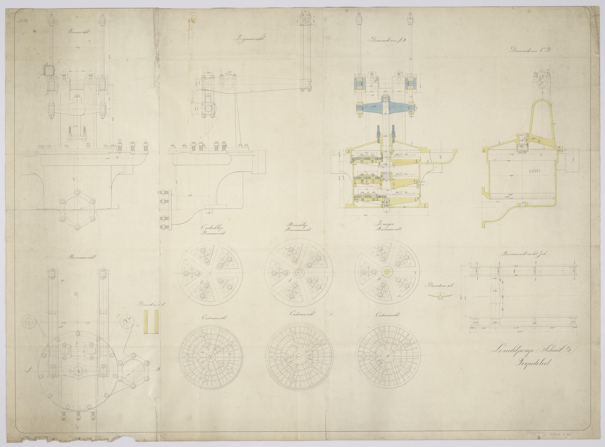 Diverse aanzichten en doorsneden van de luchtpomp aan boord van spartorpedoboot Zr.Ms. II (vermoedelijk). Originele tekening (schaal 1:2).