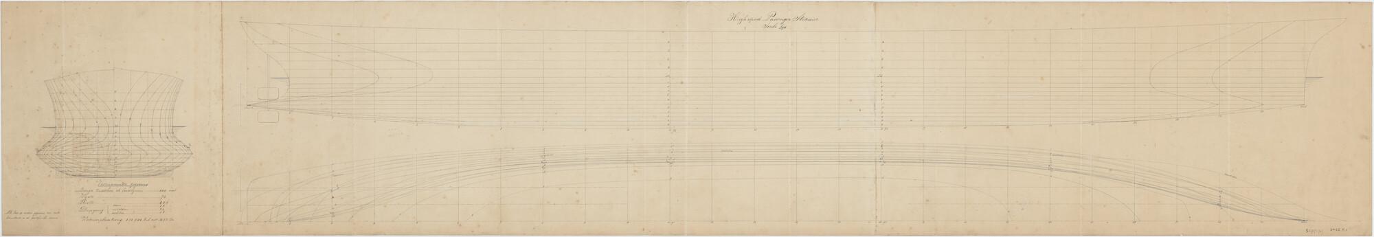 Lijnentekening en spantenraam van een High speed Passenger Steamer met ongeveer dezelfde lengte- breedte- en hoogte-verhouding als aan boord van de spartorpedoboten, later vistorpedoboten Zr.Ms. Etna en Zr.Ms. Hekla (schaal 1:96).