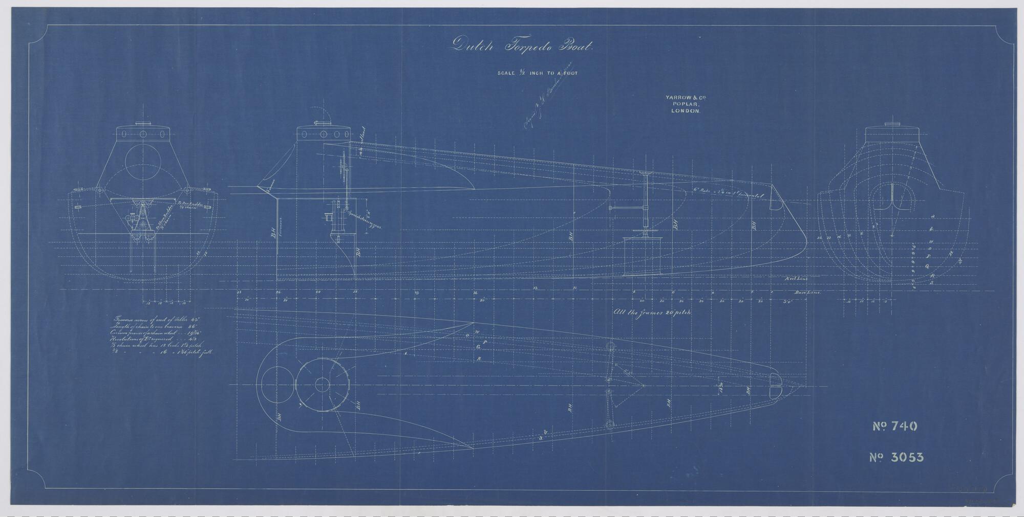 Dwarsdoorsneden, verticale langsdoorsnede en horizontale langsdoorsnede boven de waterlijn van het voorschip van een ontwerp torpedoboot uit 1885. Twee lanceerbuizen vooruit. Commandotoren, accommodatie. Vermoedelijk Zr.Ms. "Ardjoeno" (schaal ½"=1foot).
