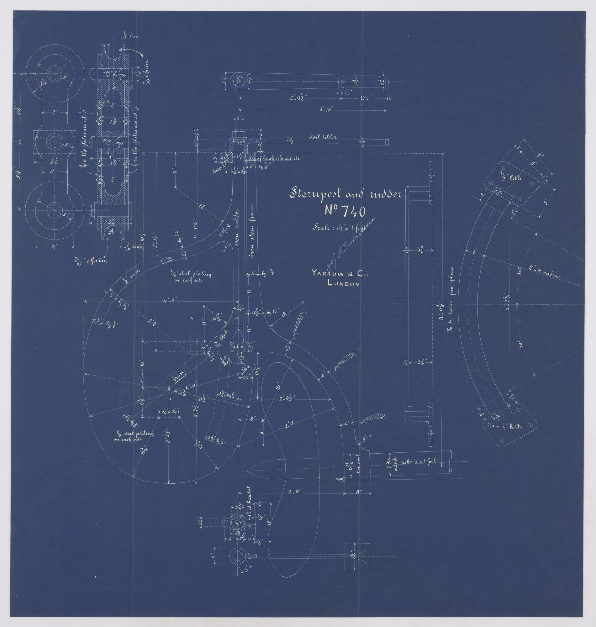 Langsdoorsnede en dwarsdoorsneden van het achterroer met schroef aan boord van de torpedoboot Zr.Ms. Ardjoeno (schaal 1½"=1 foot).