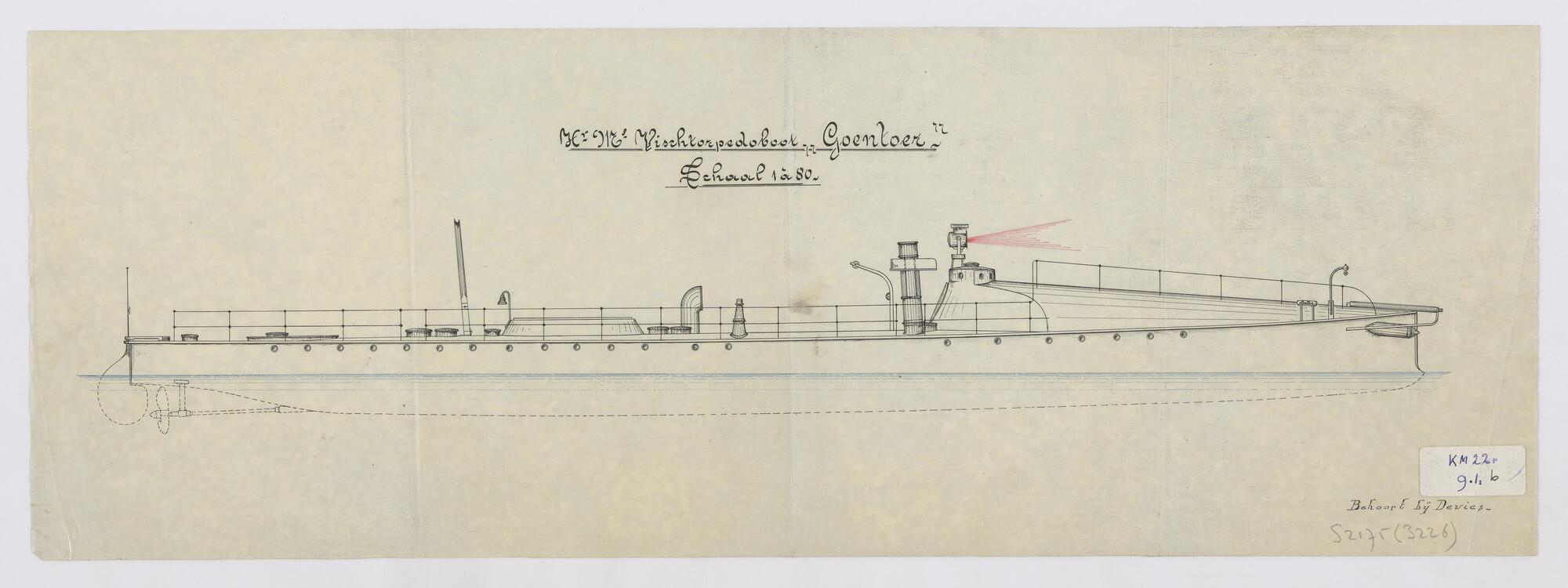Zijaanzicht over stuurboord van de vistorpedoboot Hr.Ms. "Goentoer". Boeglanceerbuis, commandotoren met zoeklicht, schoorsteen, mast, lantaarn machinekamer, koekoek, scheepsbel, schroef, roer (schaal 1:80).