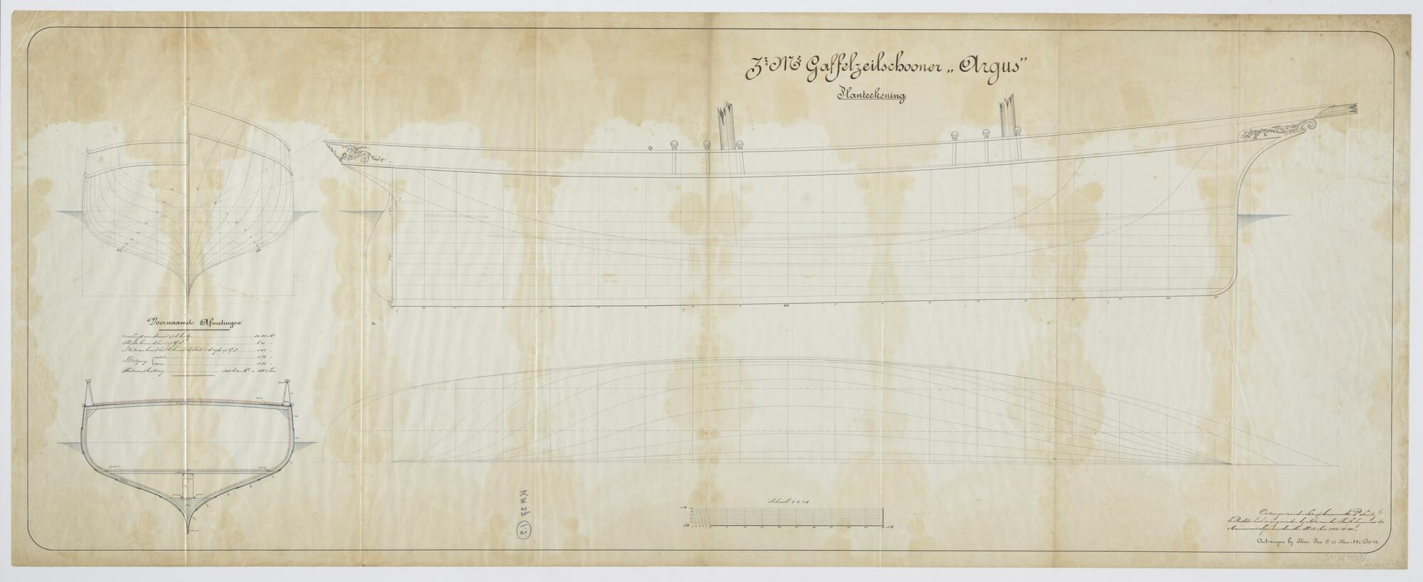 Lijnenplan ; spantenraam ; dwarsdoorsnede over het grootspant en overzicht van de voornaamste afmetingen van het stalen visserij inspectievaartuig, de gaffelzeilschoener Zr.Ms. 'Argus' . Met hout belegde dekken ; binnenzijde scheepshuid met hout bekleed.Twee masten ; boegspriet ; scheepssier (schaal 1:24).
