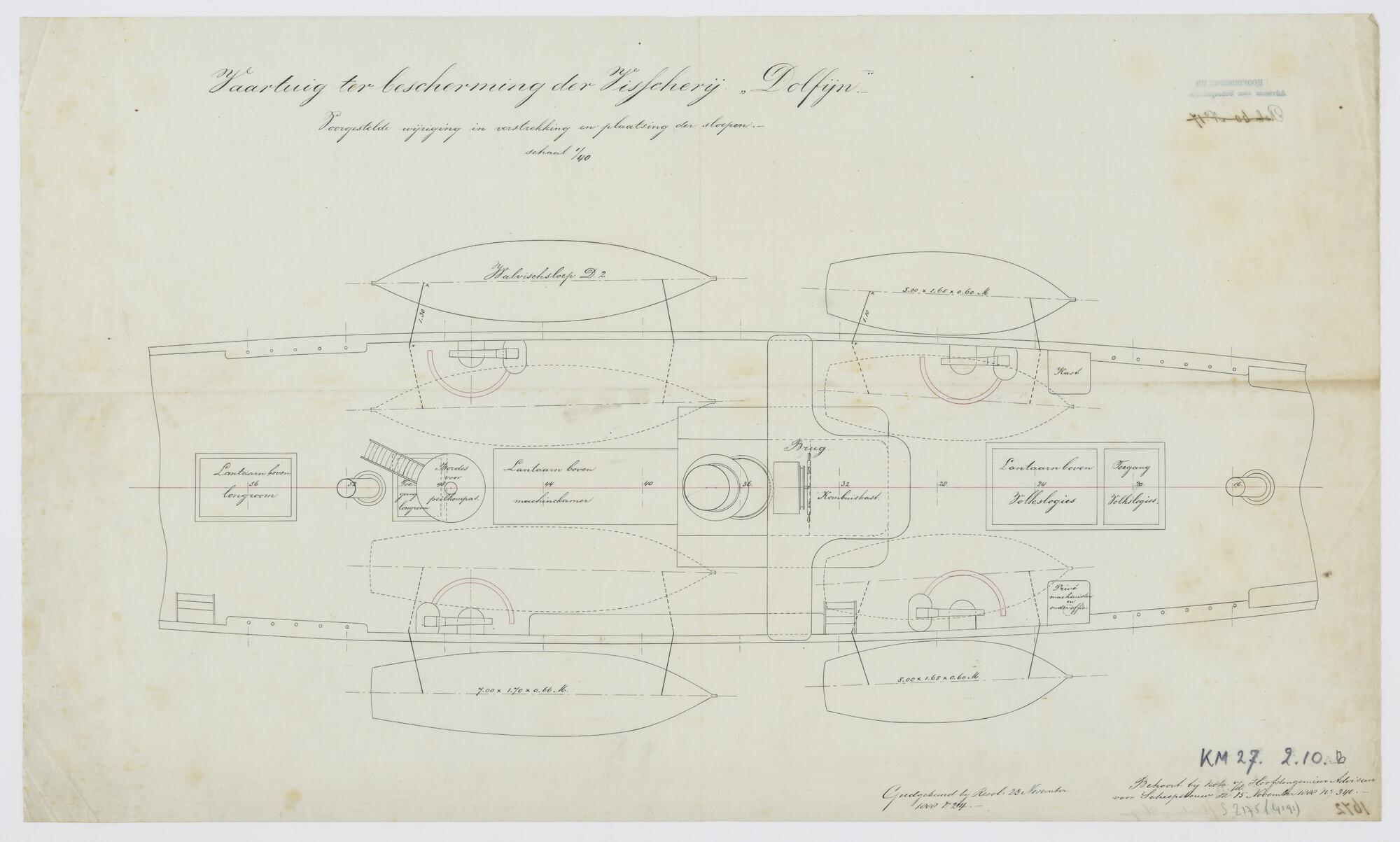 Gedeeltelijk bovenaanzicht bovendek met plaatsing sloepen aan boord van het visserij inspectievaartuig, de schoener Zr.Ms. 'Dolfijn'. Walvissloep ; sloep lang 7 meter ; twee sloepen lang 5 meter. Lantaarns en toegangen ; brug ; kombuiskast ; masten ; schoorsteen ; bordes peilkompass ; privé's (schaal 1:40).