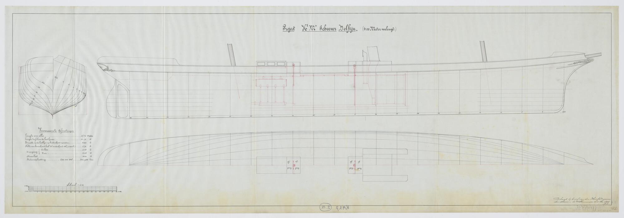Lijnentekening ; spantenraam ; overzicht van voornaamste afmetingen van het project tot verlenging van het visserij inspectievaartuig, de schoener Hr.Ms. 'Dolfijn' met zes meter (schaal 1:40).