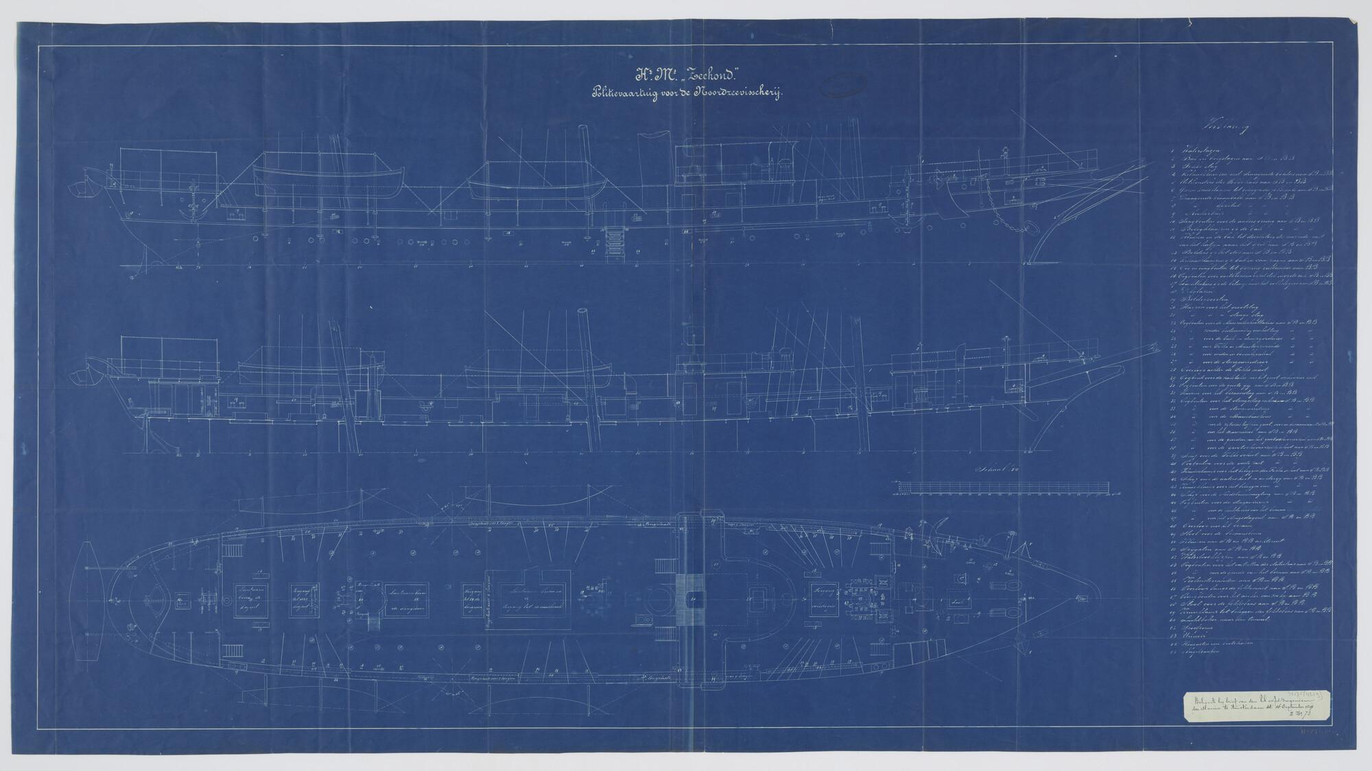Zijaanzicht ; langsdoorsnede en bovenaanzicht van het bovendek van het visserij inspectievaartuig, de schoener Hr.Ms. 'Zeehond'. Gedetailleerde tekening. Accommodatie ; ankerinrichting ; sloepen ; stuurinrichting ; navigatiebrug met kompas ; zoeklicht ; kooienverschansing ; toegangen ; lantaarns ; ventilatiekokers etc (schaal 1:50).