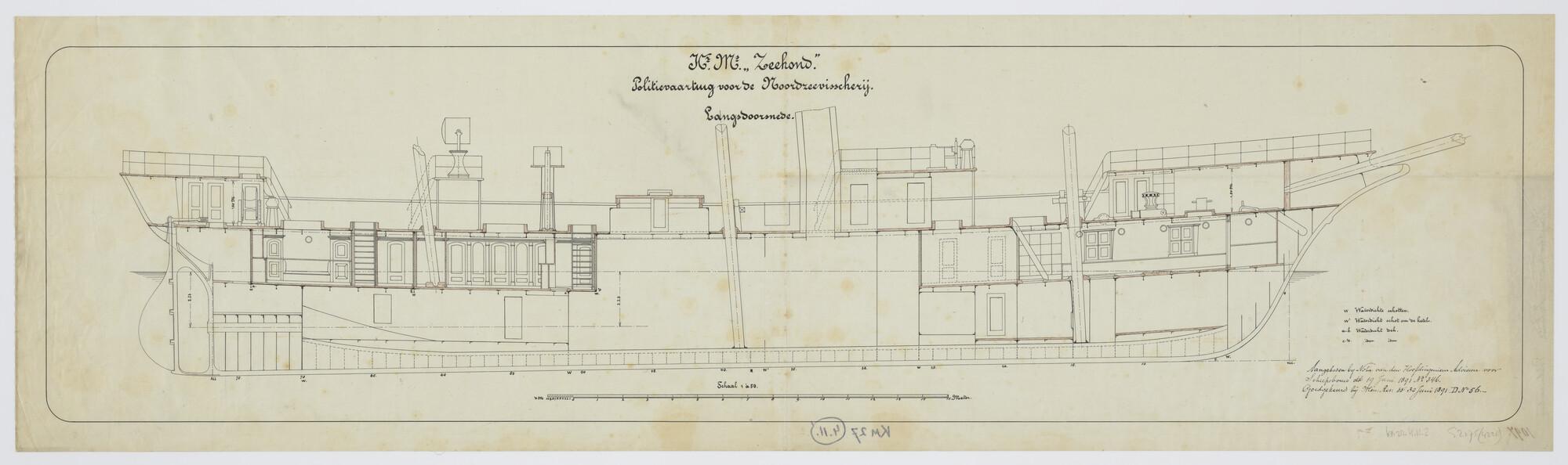 Langsdoorsnede van het visserij inspectievaartuig, de schoener Hr.Ms. 'Zeehond'. Bovendek ; tussendek ; ruim ; drie masten ; boegspriet ; navigatiebrug ; schoorsteen ; bordes peilkompas ; zoeklicht ; accommodatie ; bergplaatsen ; machinekamer ; stookplaats ; roer ; waterdichte schotten (schaal 1:50).