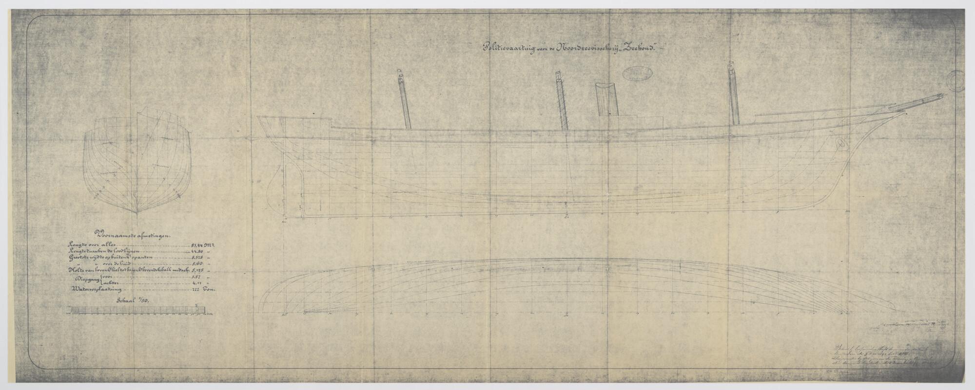 Lijnentekening met spantenraam en overzicht van de voornaamste afmetingen van het visserij inspectievaartuig, de schoener Hr.Ms. 'Zeehond'. Drie masten ; boegspriet ; schoorsteen. Schaal 1:50.