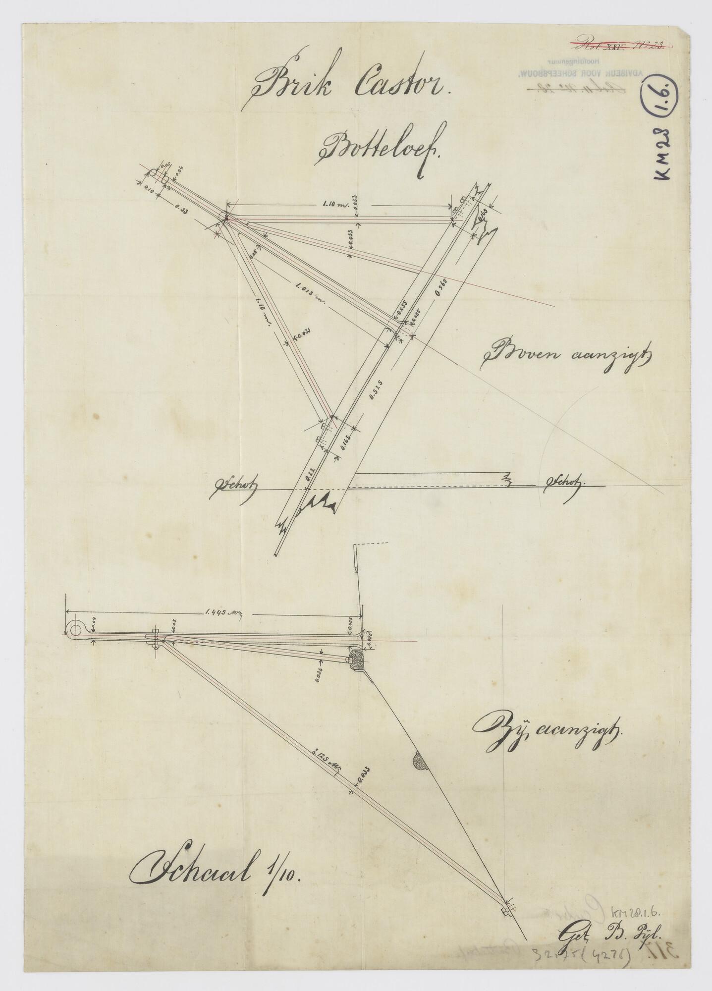 Bovenaanzicht en zijaanzicht van de botteloef op de voorsteven aan boord van het instructievaartuig, de brik Zr.Ms. 'Castor'. SB- en BB-boegstag ; waterstag (schaal 1:10).