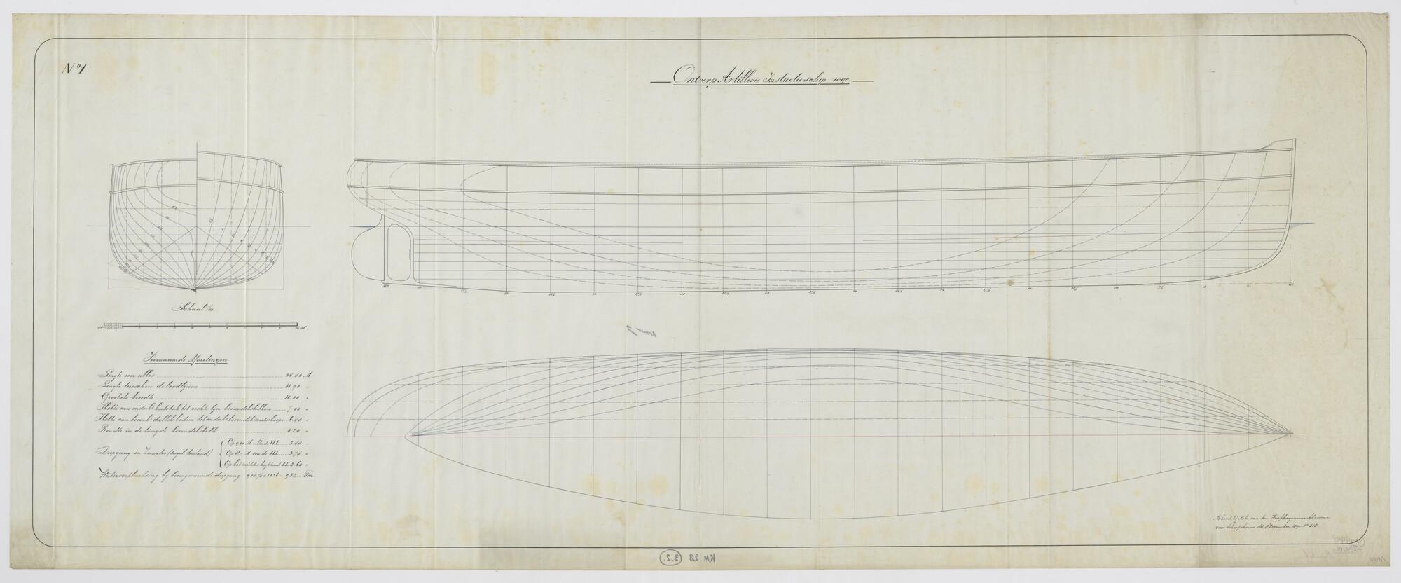 Lijnentekening en spantenraam van het ontwerp artillerie instructieschip 1890 Hr.Ms. 'Bellona'. Overzicht van de voornaamste afmetingen (schaal 1:50).