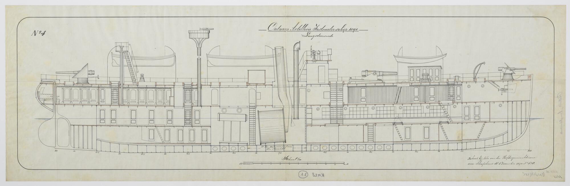 Langsdoorsnede van het ontwerp artillerie instructieschip 1890 Hr.Ms. 'Bellona'