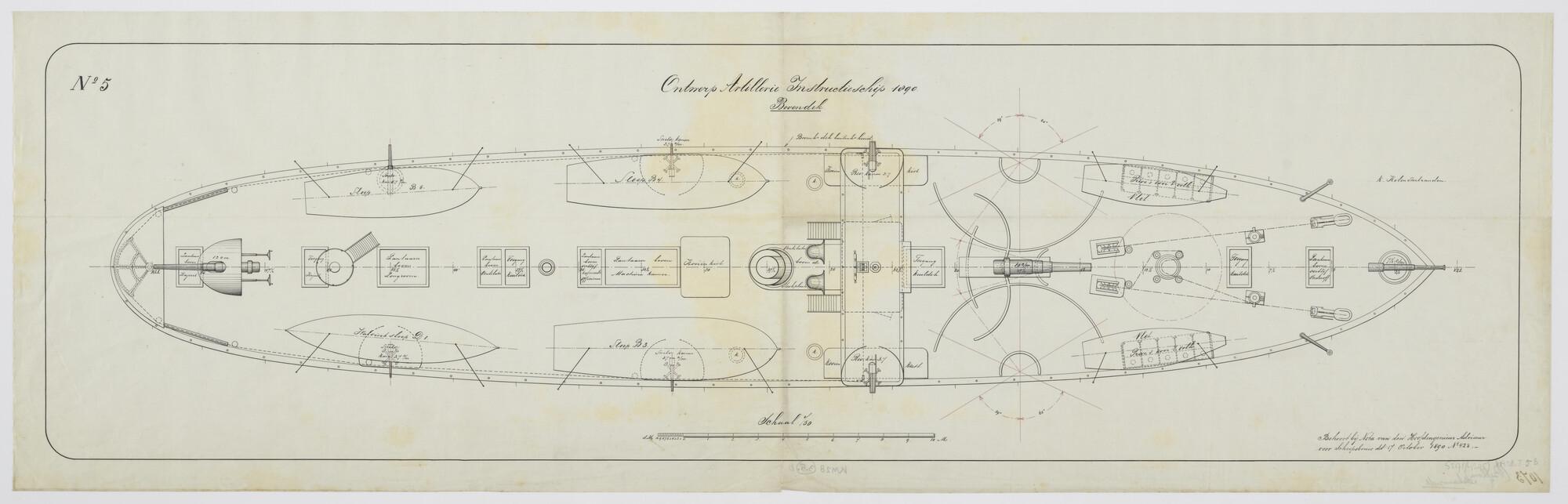 Bovendek van het ontwerp artillerie instructieschip 1890 Hr.Ms. 'Bellona'. Scheepsgeschut ; vuurlijnen ; sloepen ; ankerinrichting ; lantaarns ; toegangen ; kooienkisten ; bordes peilkompas ; luchtkokers ; roerkwadrant ; kolenstortranden (schaal 1:50).