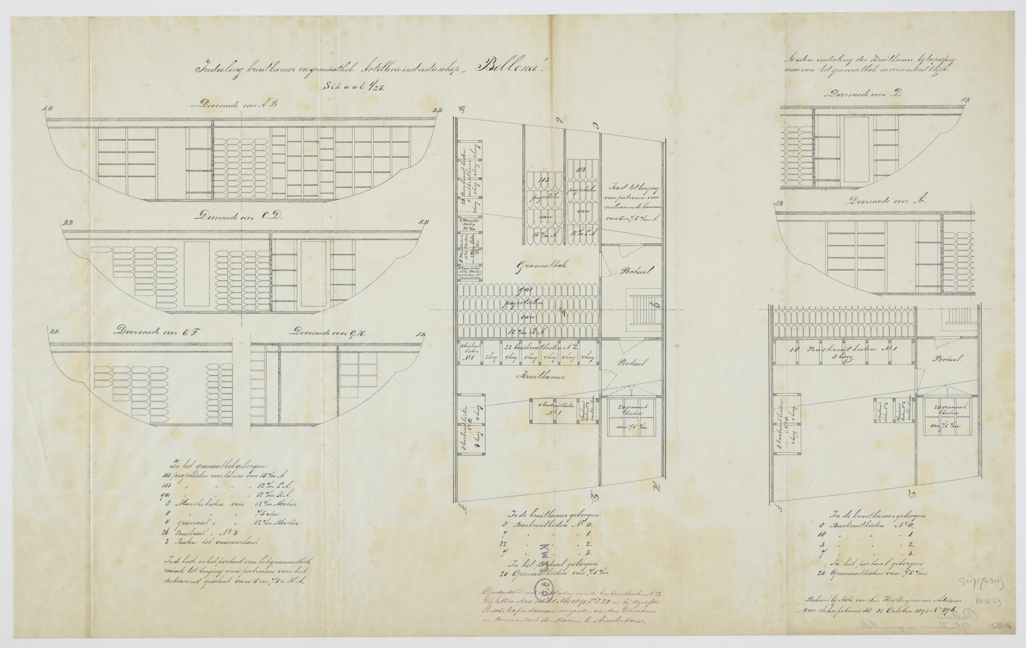 Indelingstekening van de kruitkamer en het granaathok aan boord van het artillerie instructieschip Hr.Ms. 'Bellona'. Diverse doorsneden en aanzichten. Opgave van aantallen en soorten. Munitiekisten ; buskruitkisten ; granaatkisten ; projectielen (schaal 1:25).