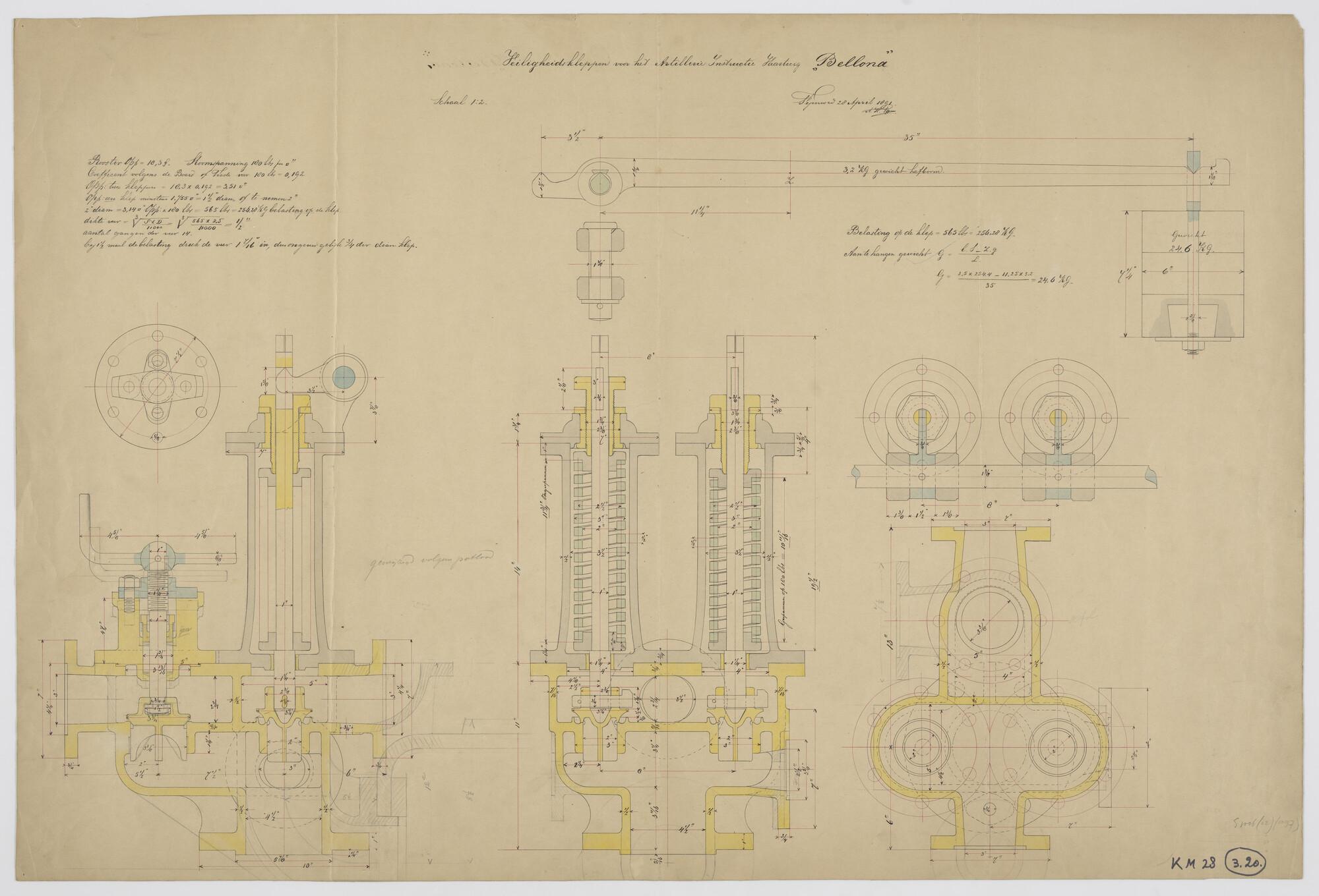 Diverse doorsneden van de veiligheidskleppen aan boord van het artillerie instructieschip Hr.Ms. 'Bellona' (schaal 1:2).
