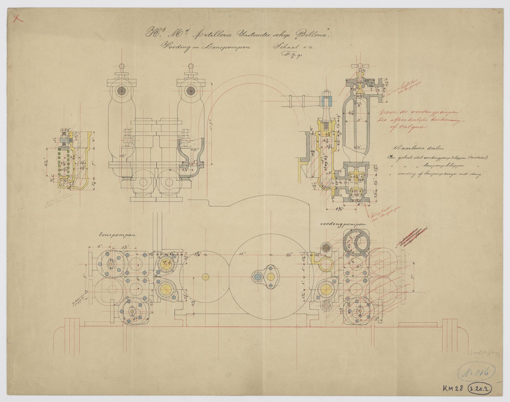 Diverse doorsneden van de voeding- en lenspompen aan boord van het artillerie instructieschip Hr.Ms. 'Bellona' (schaal 1:4).