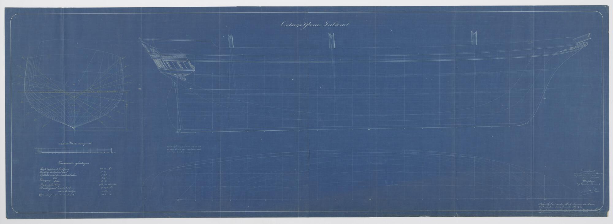 Lijentekening en spantenraam van het instructieschip, het ijzeren zeilkorvet Zr.Ms. 'Nautilus' [ontwerp]. Overzicht van voornaamste afmetingen. Scheepssier aan boeg en achtersteven. Drie masten en boegspriet (schaal 1:40).