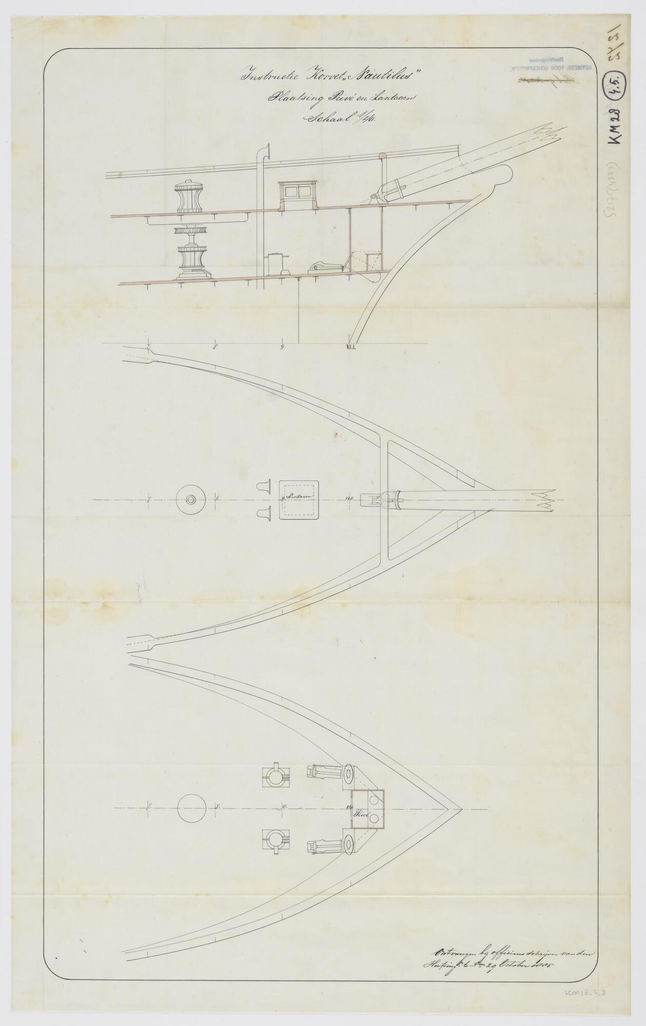 Langsdoorsnede en bovenaanzichten van de bak en kuildek aan boord van het instructieschip, het ijzeren zeilkorvet Zr.Ms. 'Nautilus'. Plaatsing privé vooruit ; ankerkluizen ; kaapstander ; ventilatiekokers ; lantaarn ; boegspriet (schaal 1:40).