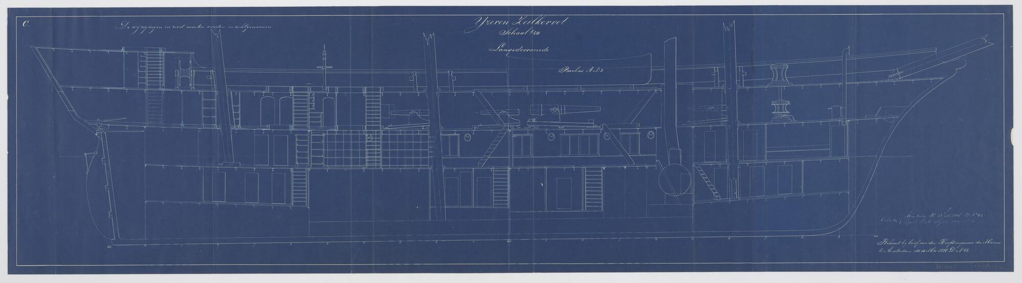 Langsdoorsnede van het instructieschip, het ijzeren zeilkorvet Zr.Ms. 'Nautilus'. Drie masten ; boegspriet ; kampanje ; bovendek ; kuildek met bewapening ; tussendek ; koebrugdek vooruit en achteruit ; kaapstander ; barkas A3 ; stuurinrichting ; roer ; ladders ; ketelruim met hulpketels ; schoorsteen ; ventilatiekokers (schaal 1:40).