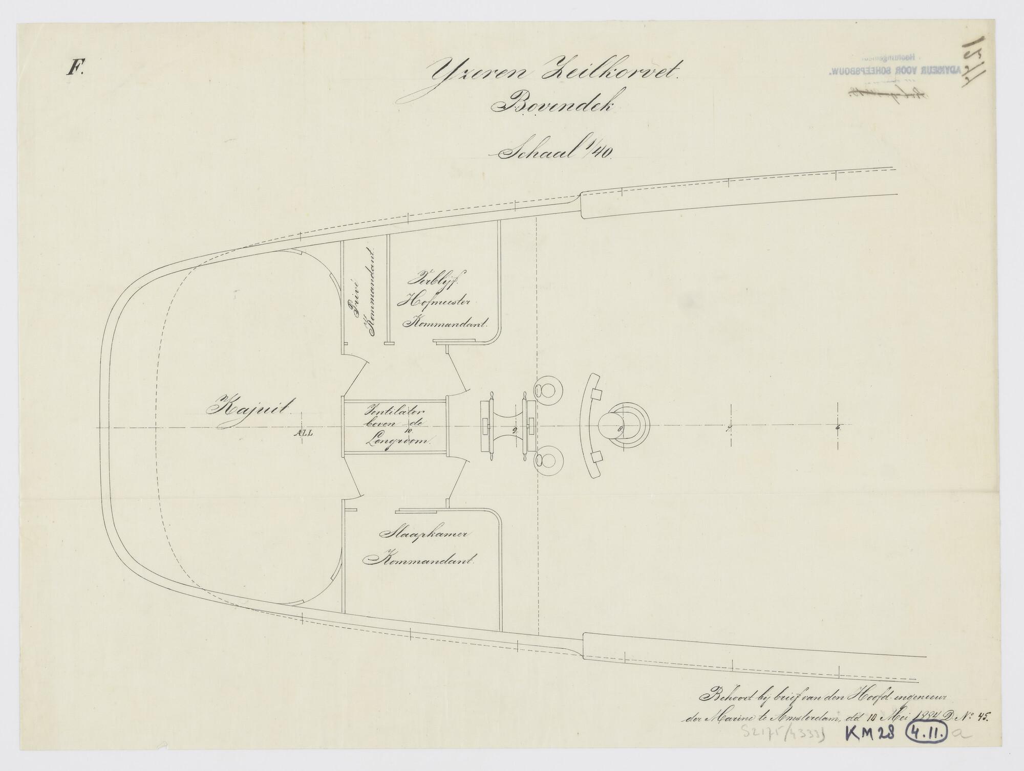Indelingstekening van het bovendek achteruit aan boord van het instructieschip, het ijzeren zeilkorvet Zr.Ms. 'Nautilus'. Bezaanmast ; stuurwiel ; slaapkamer commandant ; verblijf hofmeester commandant ; privé commandant ; kajuit (schaal 1:40).