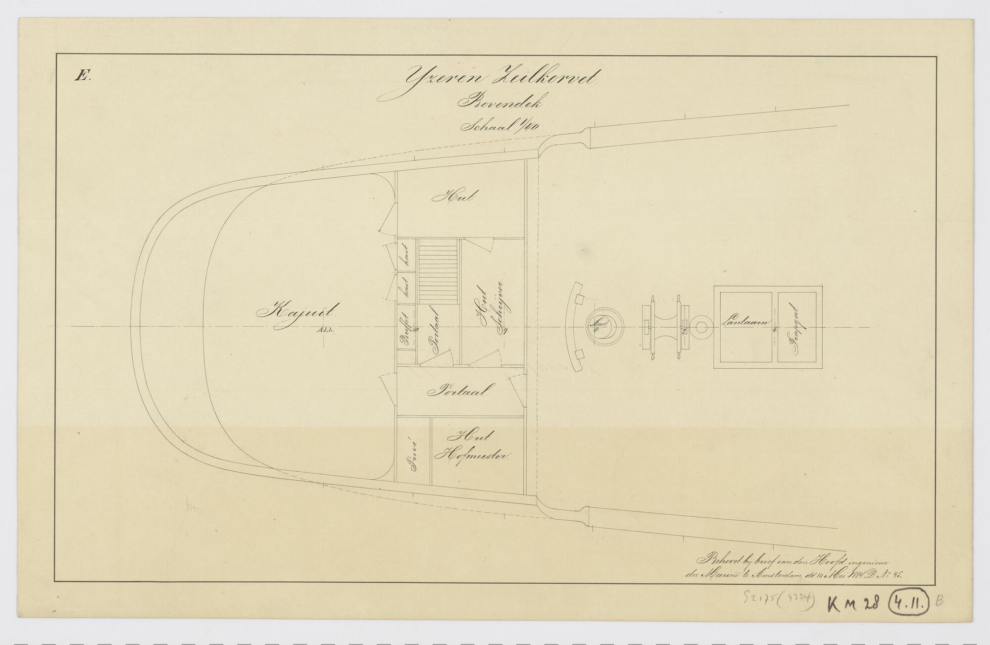 Indelingstekening van het bovendek achteruit aan boord van het instructieschip, het ijzeren zeilkorvet Zr.Ms. 'Nautilus'. Lantaarn met trapgat ; stuurwiel ; bezaansmast ; hut hofmeester ; hut schrijver ; slaaphut commandant ; privé commandant ; kajuit (schaal 1:40).