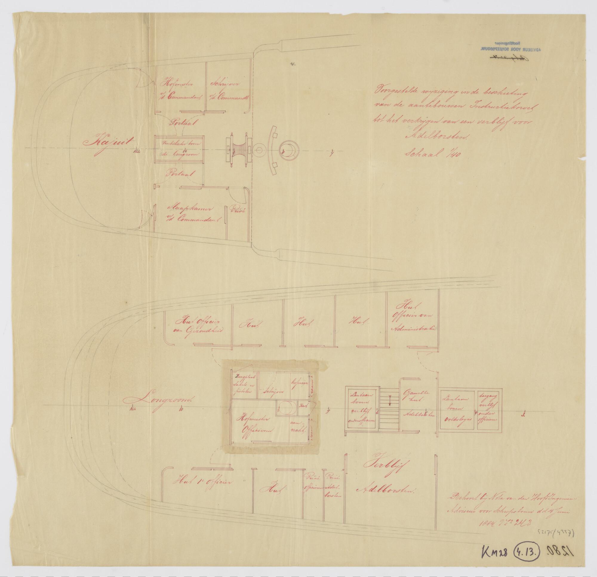 Wijzigingen indeling bovendek en kuildek achteruit in verband met het inrichten van een verblijf adelborsten aan boord van het instructieschip, het ijzeren zeilkorvet Zr.Ms. 'Nautilus' (schaal 1:40).