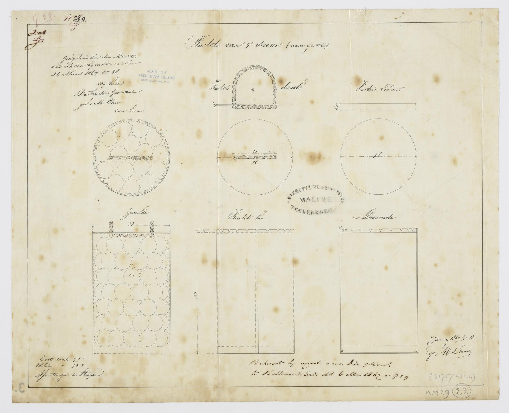 Diverse doorsneden van een kartetsbus van 7 duim met lading, deksel met hengsel (schaal 1:1).