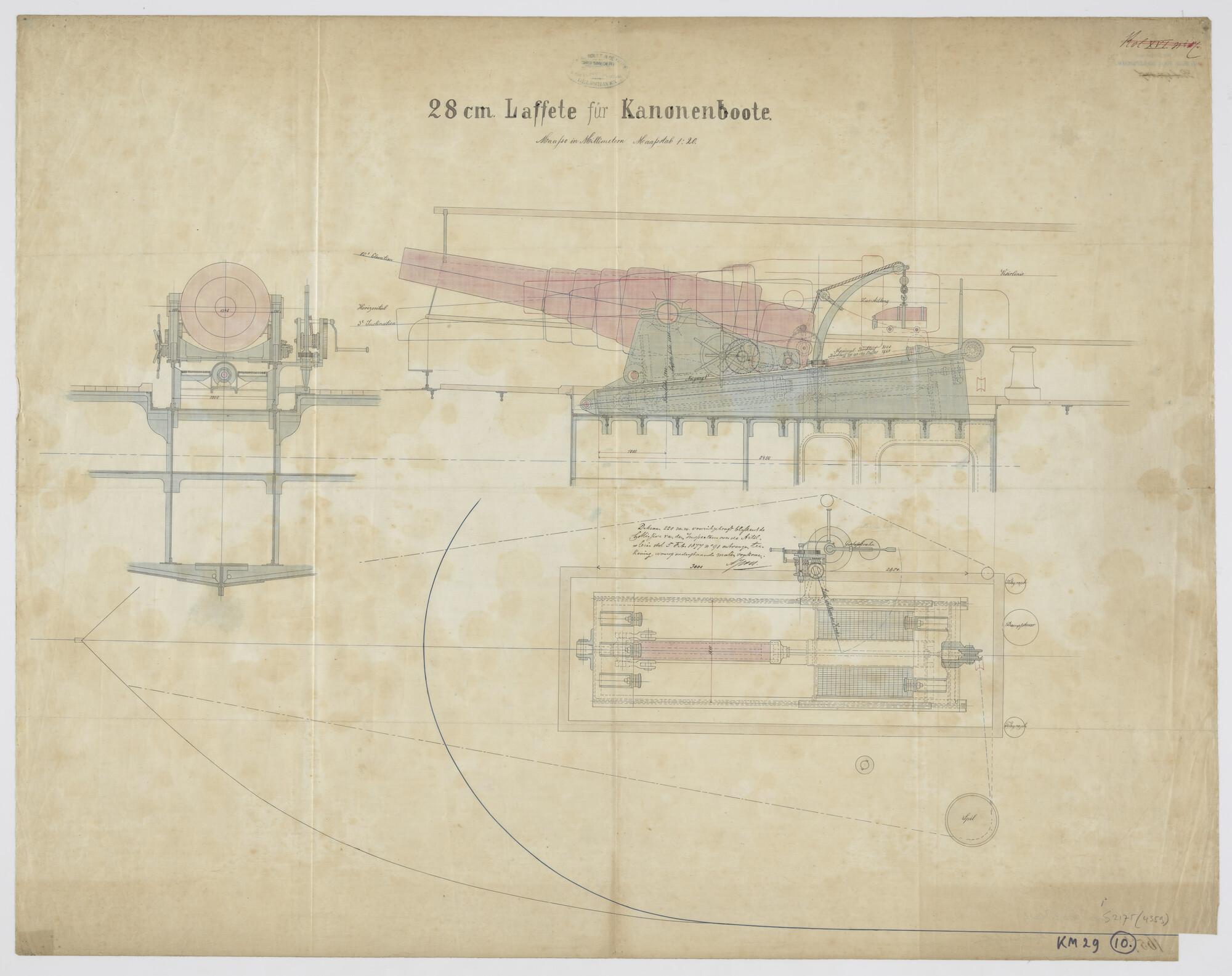 Doorsneden van het 28 cm kanon van de stoomkanonneerboten, onder meer de stoomkanonneerboot Zr.Ms. 'Thor'. Verticale langsdoorsnede, horizontale dwarsdoorsnede en verticale dwarsdoorsnede van het 28 cm kanon (schaal 1:20).