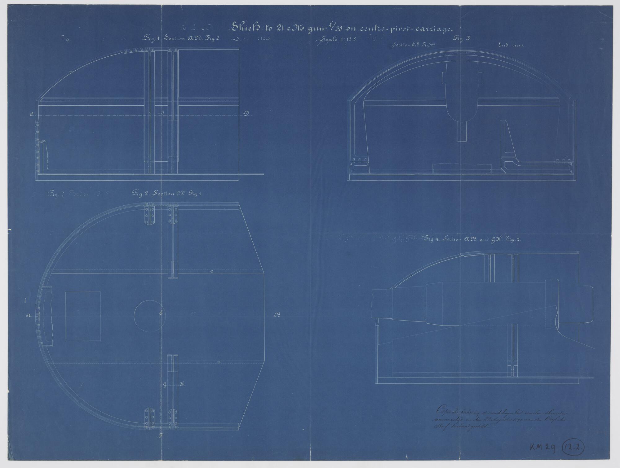 Pantserschild van het kanon van 21cm met middenpivot affuit. Verticale en horizontale langsdoorsnede ; dwarsdoorsnede (schaal 1:12,5).