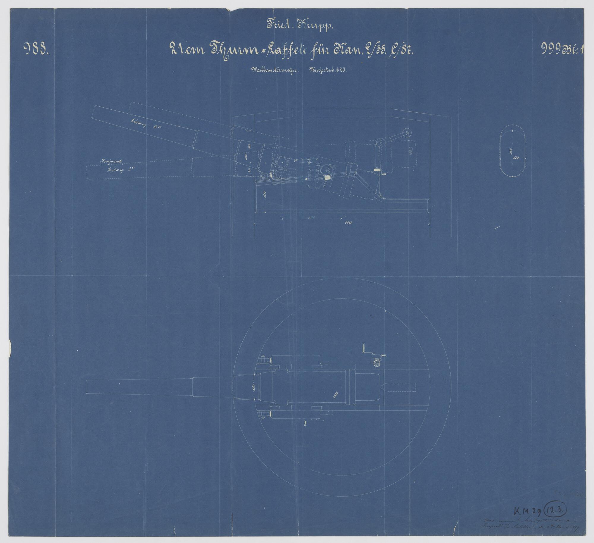 Geschutkoepel voor 21cm Kanon A L/35 C/87. Verticale en horizontale langsdoorsnede (schaal 1:20).