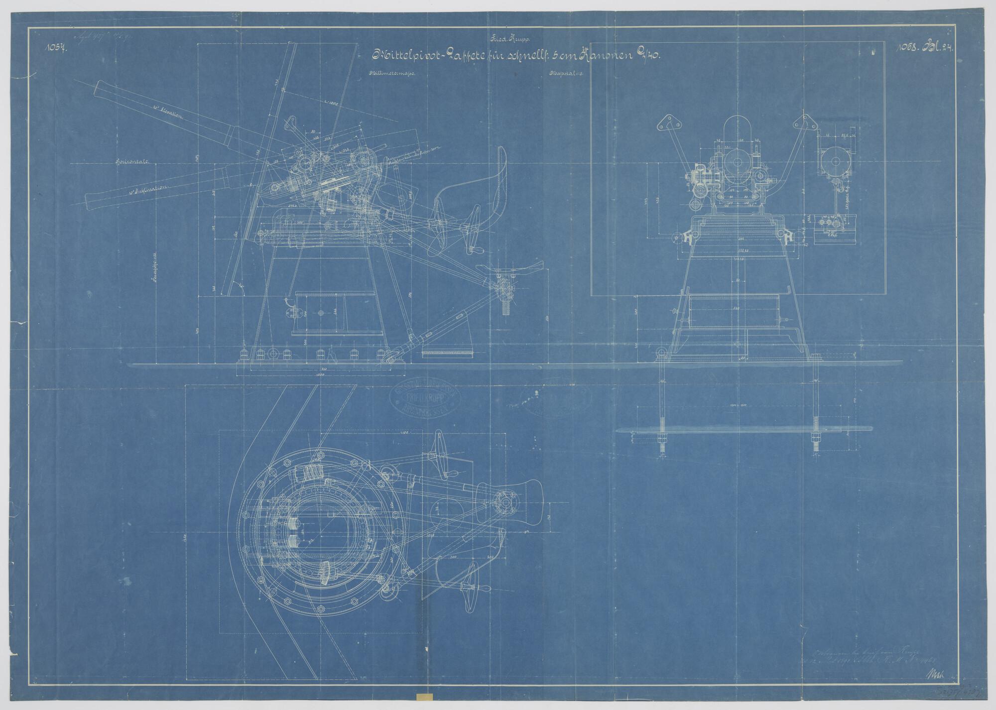 Snelvuurkanon van 5cm L/40 op middenpivot affuit. Verticale en horizontale langsdoorsnede en dwarsdoorsnede (schaal 1:5).
