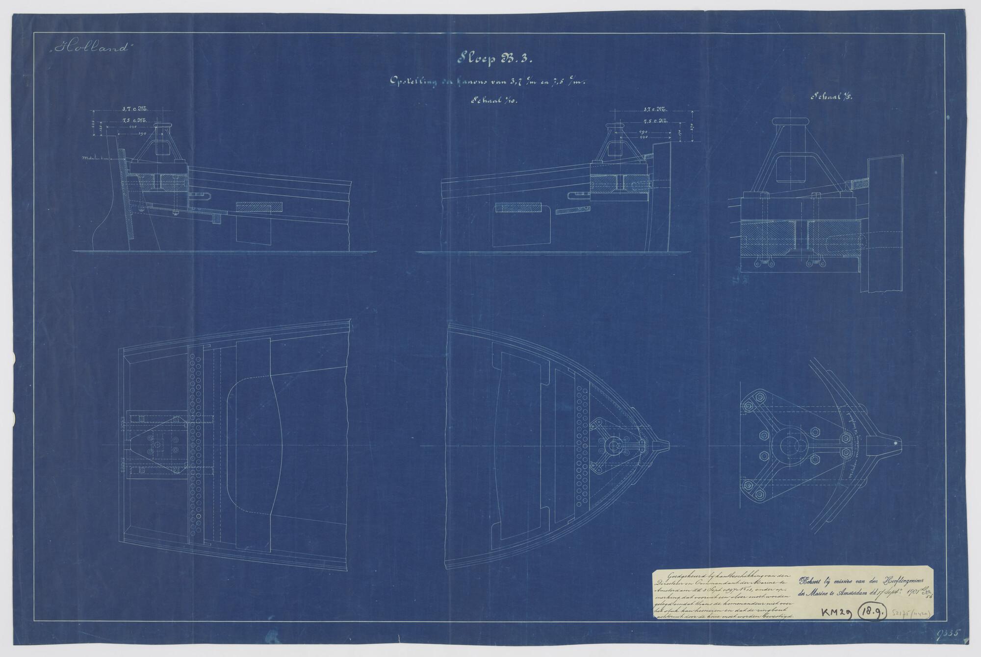 Diverse doorsneden van de sloep B3 van het pantserdekschip Hr.Ms. 'Holland' met opstelling kanons 3.7cm en 7.5cm. Sloepsaffuiten (schaal 1:10).