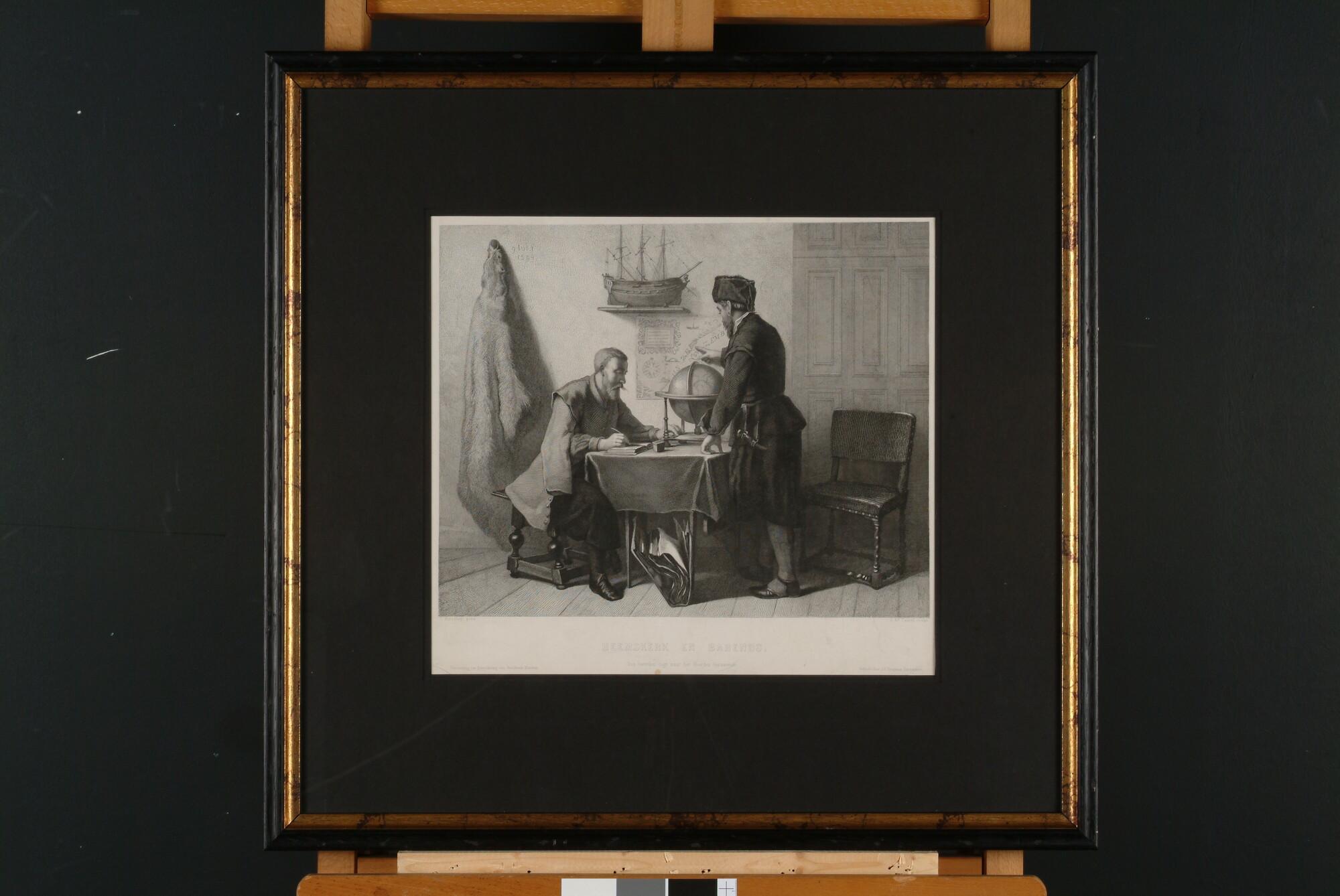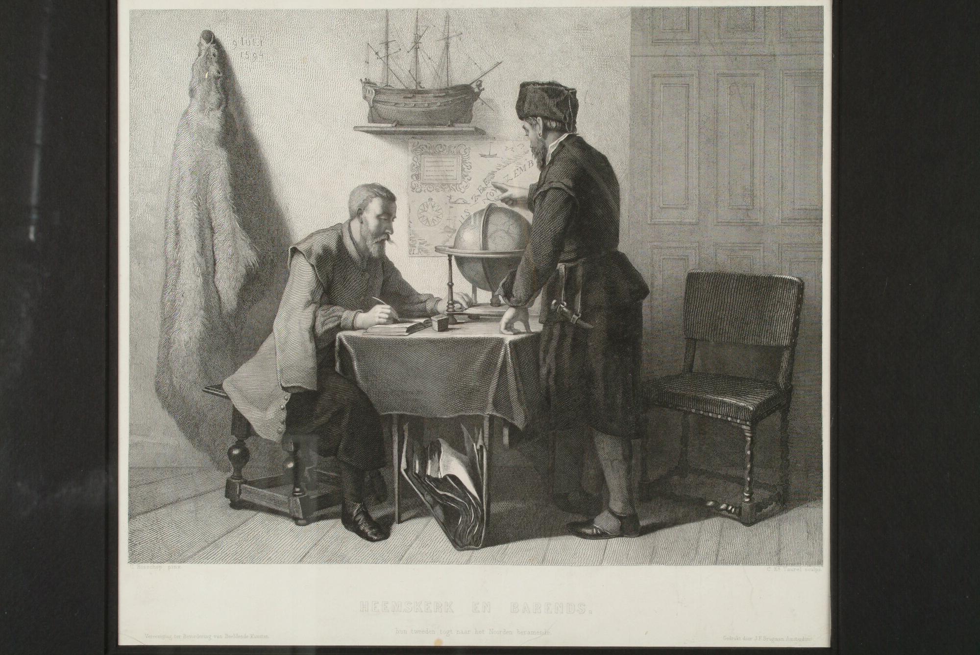 Heemskerck en Barentsz, in een interieur, bezig met de voorbereiding van hun tweede tocht naar het Noorden, 1595.