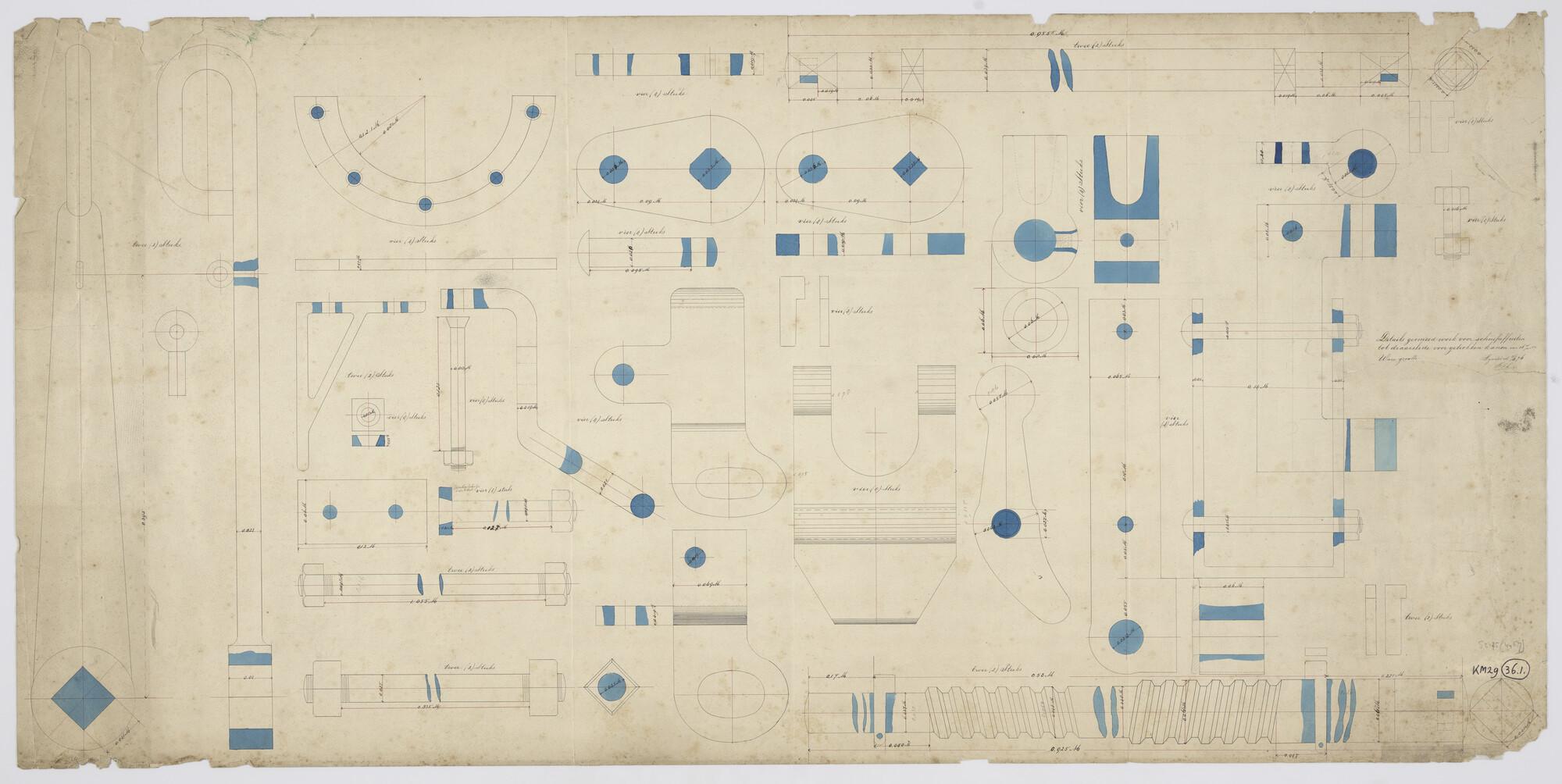 Doorsneden van details gesmeed werk voor schuifaffuiten tot draaislede voor getrokken kanon van 16 cm No 1 (schaal 1:1).