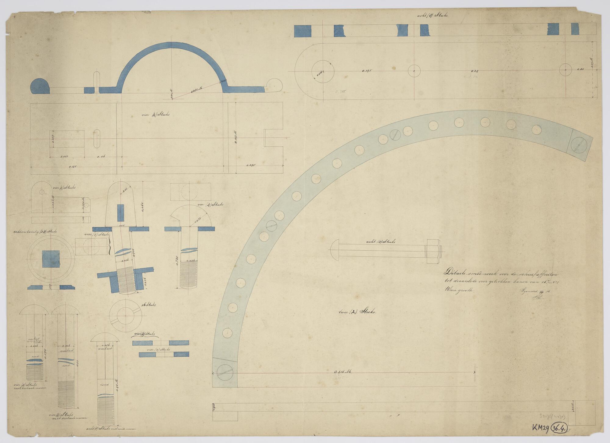 Doorsneden van details van het smeedwerk voor schuifaffuiten tot draaislede voor getrokken kanon van 16 cm No 1 (schaal 1:1).